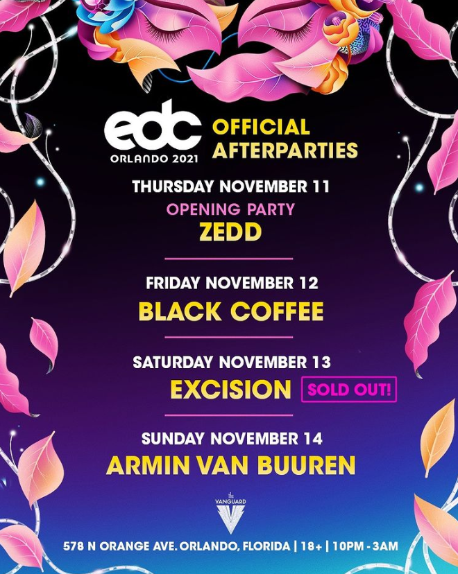 EDC Orlando 2021每日狂欢前后还有几场于当地夜店Vanguard举行的“After” Parties(也含预热派对)
