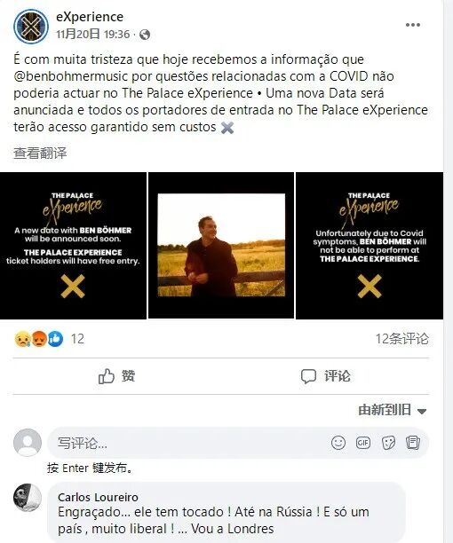 事实上,德国True House Music DJ/制作人Ben Böhmer是此次为数不多的艺人中第一个被官方公布者,经过笔者调查,Ben Böhmer并未确诊Xin Guan阳性,官方提到的“Covid问题”可能是跨国出入受限?但从下图我们看到还有乐迷说到“搞笑...Ben Böhmer一直在演出(放歌)!”。