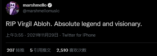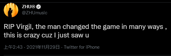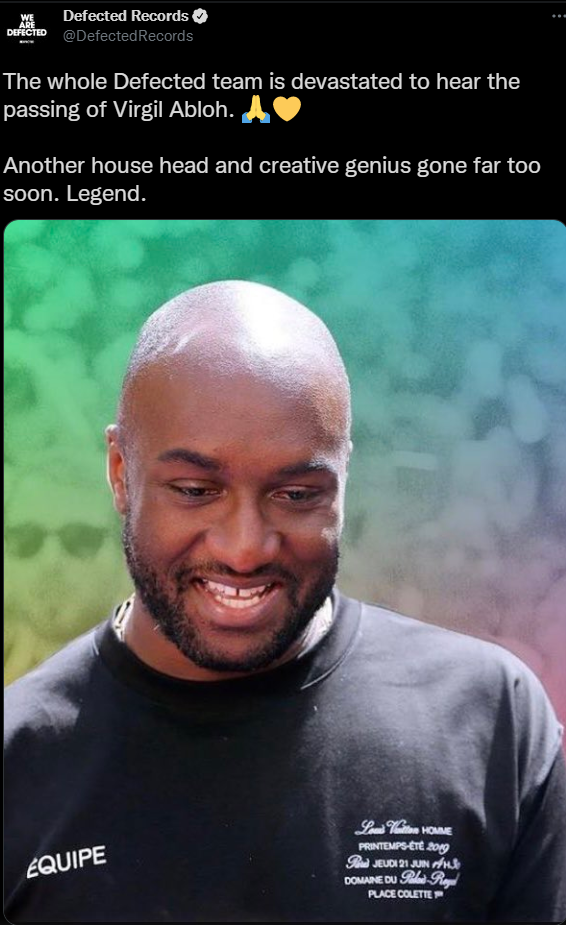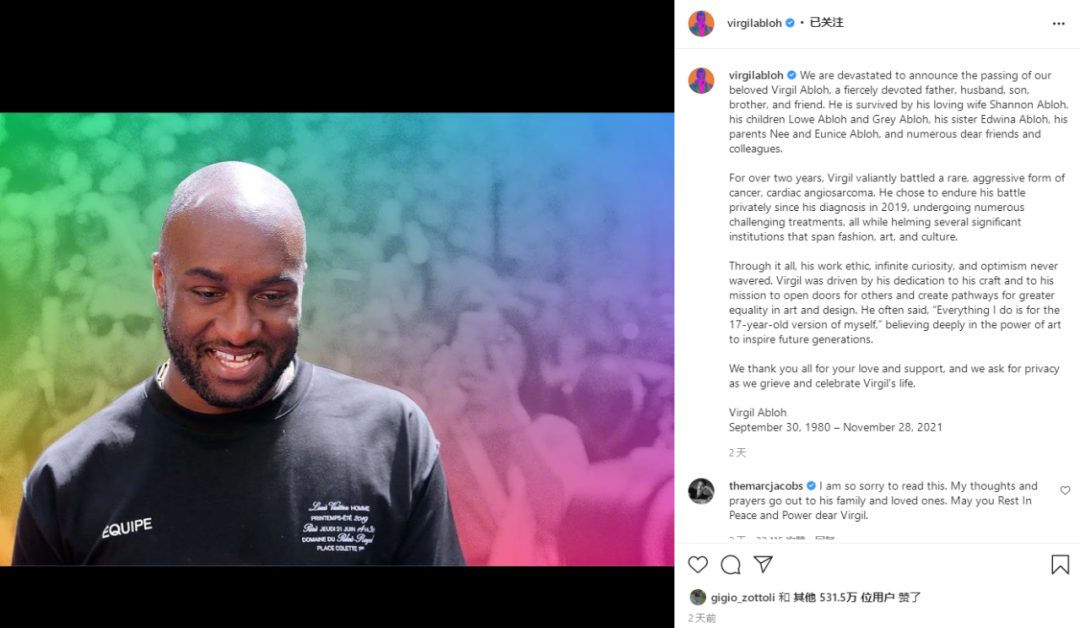 2021年11月28日,身兼设计师(不只是时装设计师)、企业家(创立了Off-White企业)、DJ、制作人的美国著名才子Virgil Abloh在芝加哥去世,享年41岁。当天,法国奢侈品牌Louis Vuitton和意大利奢侈品兼潮牌Off White都发布了其英年早逝(至少在美国,41岁仍算壮年。而英年是指青年+壮年,这名美国人符合该范围)的讣告。