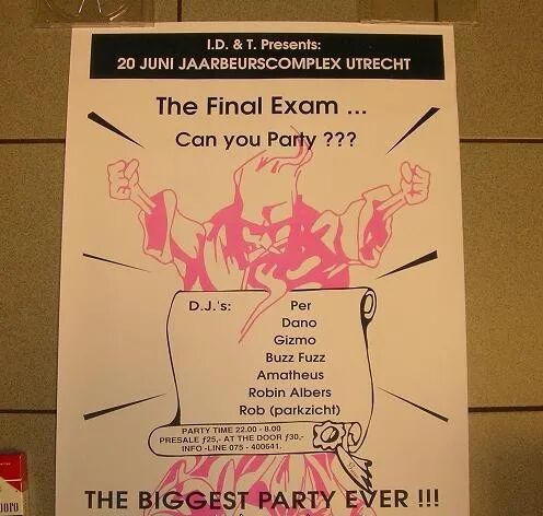 图片来自The Final Exam 图片版权属于原主“The Final Exam(期末考试)”便是Thunderdome的前身,活动结果出乎意料地取得了巨大成功,以至于不久后ID&T的名气就传遍了整个荷兰乃至欧洲。由此也奠定了Thunderdome主打电音里的Harder Styles、Harder Styles之中的Hardcore、同时又主打Hardcore里面的早期子风格(之一)Gabber的传统。