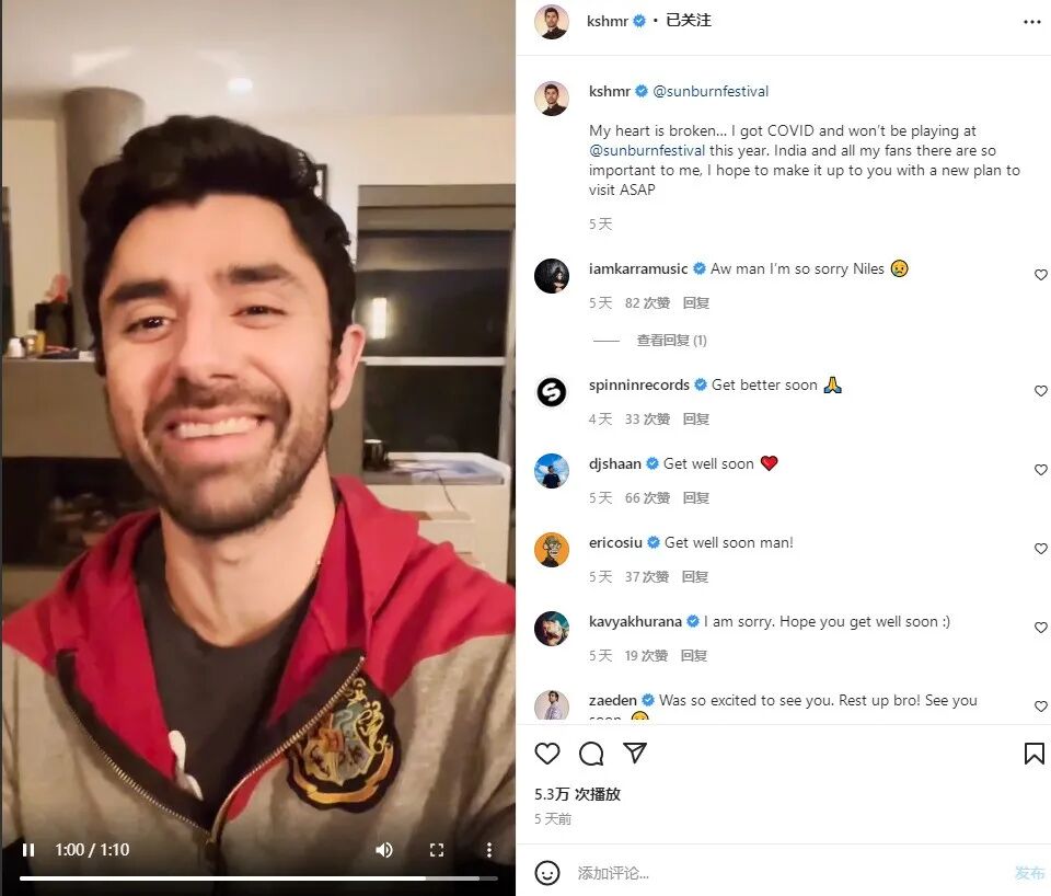 图片来自KSHMR 图片版权属于原主鉴于视频中KSHMR的用词,并结合下文的内容综合看来,你也许也会有与笔者同样的猜测。KSHMR从第二句就开始强调自己因为此次感染Xin Guan而无法参加Sunburn Festival,且一分多钟的视频中,三句话不离Sunburn Festival及其所在地区——印度。