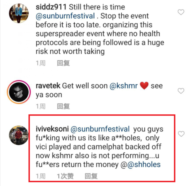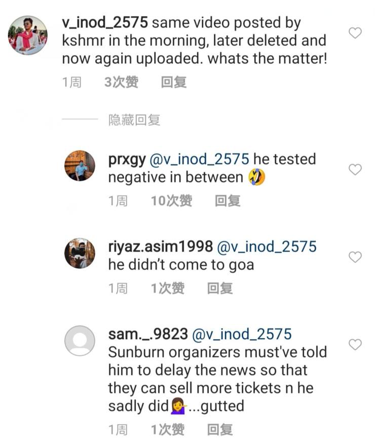 鉴于此不可抗力因素,粉丝们并没有对KSHMR的“失约”进行抱怨。不过,仍然有细心的乐迷发现KSHMR最先发过一次该动态,并认为Sunburn Festival为了尽可能地多卖门票而让KSHMR删除动态、等接近音乐节快开始了再发布,不管真相是否如此,总之,KSHMR感染(Xin Guan)肺炎的事情看起来十分蹊跷。