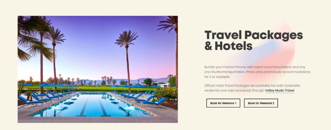 2022年的Coachella音乐节兼艺术节将于四月15至17日、22日至24日“双周末”展开。有人认为这种“双周末”的模式参考了Tomorrowland,也有人持有将主语和谓语对调的态度。主办方Goldenvoice尝试在多方面保留音乐节的“传统习俗”,延续各国消费者的“游戏体验”。