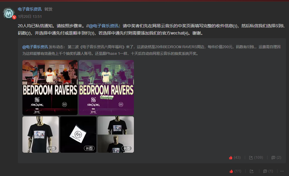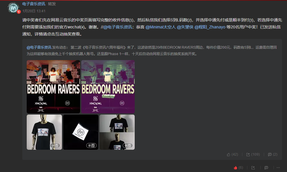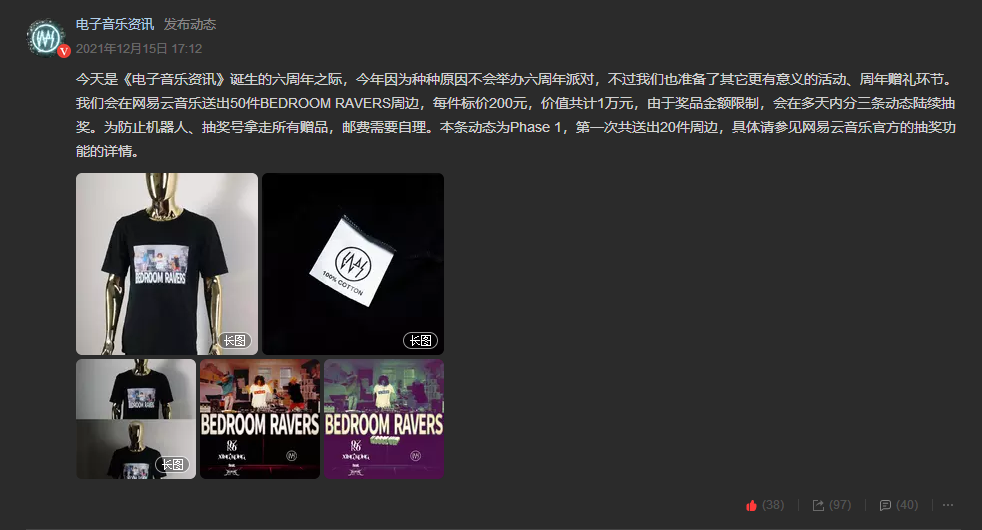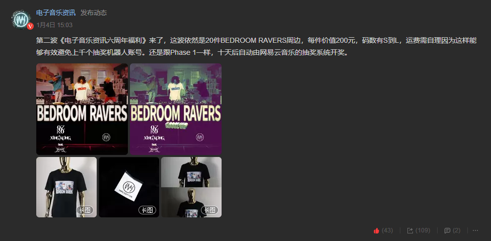 在2021年12月15日至2021年1月期间,电子音乐资讯账号@网易云音乐平台已发放Phase 1和Phase 2的抽奖动态,并已由网易云音乐官方的抽奖工具开奖。截止至目前,奖品已几乎发放完毕,Phase 2同比Phase 1还人性化地“开通”了让中奖者自选到付或先付的渠道。Phase 1的奖品是由电子音乐资讯周边呈现的BEDROOM RAVERS Tee×20件;Phase 2的奖品同样是由电子音乐资讯周边呈现的BEDROOM RAVERS Tee×20件;而Phase 3则将在春节结束后(大概初七的样子?按道理不超过初八)发放(本次)最后的10件BEDROOM RAVERS Tee周边。与Phase 2相同,本次抽奖福利于网易云音乐上的电子音乐资讯认证账号发起,由网易云音乐的官方抽奖工具开奖,我们无法人为地干涉抽奖结果。且为了(超级有效地)防范成百上千乃至过万的抽奖号介入,Phase 3仍需中奖者自行承担运费,可选择中通先付或顺丰到付。其它程序和内容亦与Phase 1、Phase 2的抽奖无明显差异,码数由读者朋友们在S到L之间自选,感兴趣参与的电音爱好者可在网易云音乐平台上搜索”电子音乐资讯“找到红V品牌认证账号(千万注意,只能通过手机端操作,电脑端无法显示官方抽奖功能页面),我们非常期待您的参与,也感谢您在过去六年来及未来六千年外的陪伴。