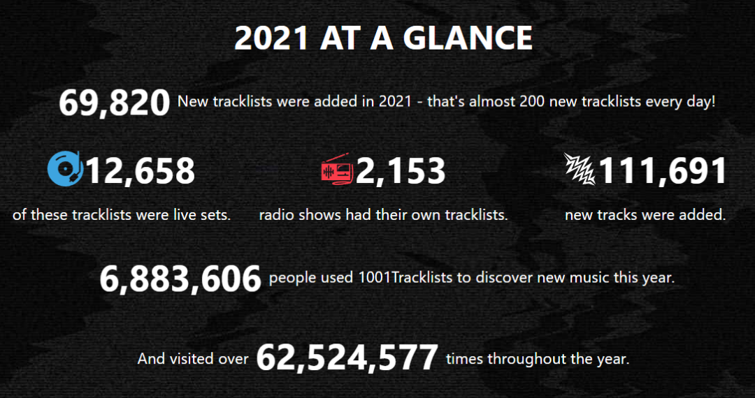 好了。在您已经保证了解两个重要前提的情况下,我们进入正文。熟悉电子音乐(Electronic Music)、跳舞音乐(Dance Music)的你,定然也对1001Tracklists不陌生。1001Tracklists是全球最受欢迎的专门记录DJ Set表演之播放列表、曲目列表的网站、品牌。图片来自1001Tracklists 图片版权属于原主1001Tracklists尽最大的可能性记载全球较多电子音乐派对、电子音乐类音乐节的DJ Set(打碟设定的演出)所包含的音乐清单并以此为前提展开各种排行榜,除了“101大制作人”排行榜在国内外均有较大受众之外,他们旗下一年一度的产业报告也非常值得我们深度解析。图片来自1001Tracklists 图片版权属于原主2022年1月中旬左右,1001Tracklists如往年般揭晓了《A State Of Dance Music》的各项指标结果,下文将其(这份最新报告)称作《A State Of Dance Music 2021》(也是官方说法)。按照报告的规则,该报告与其站内的播放列表、曲目、电台等资源环环紧扣。