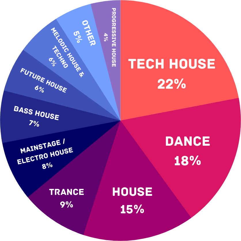 按照全球DJ们最爱播放的曲目来划分风格的话,全球范围内的DJ们最喜欢播放Tech House(22%),这倒不意外,与往年相似;然后则是未被详细分类(没有被细分)的舞曲,这一块比较模糊,毕竟1001Tracklists站内的很多音乐未被细分,范围略大不过多解释。
