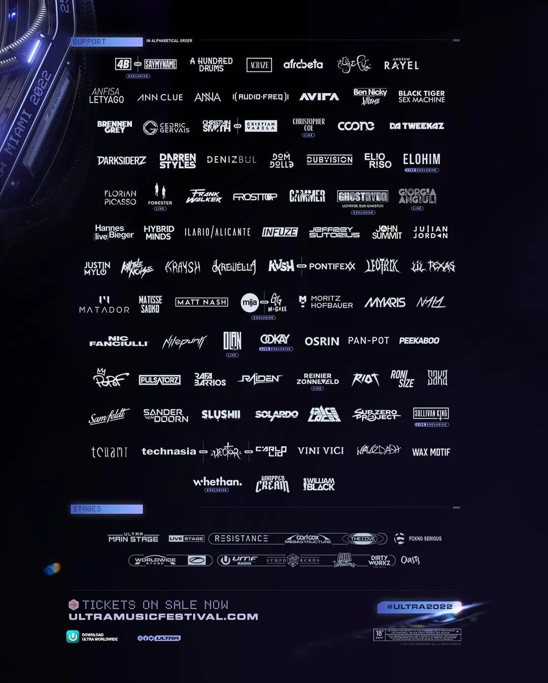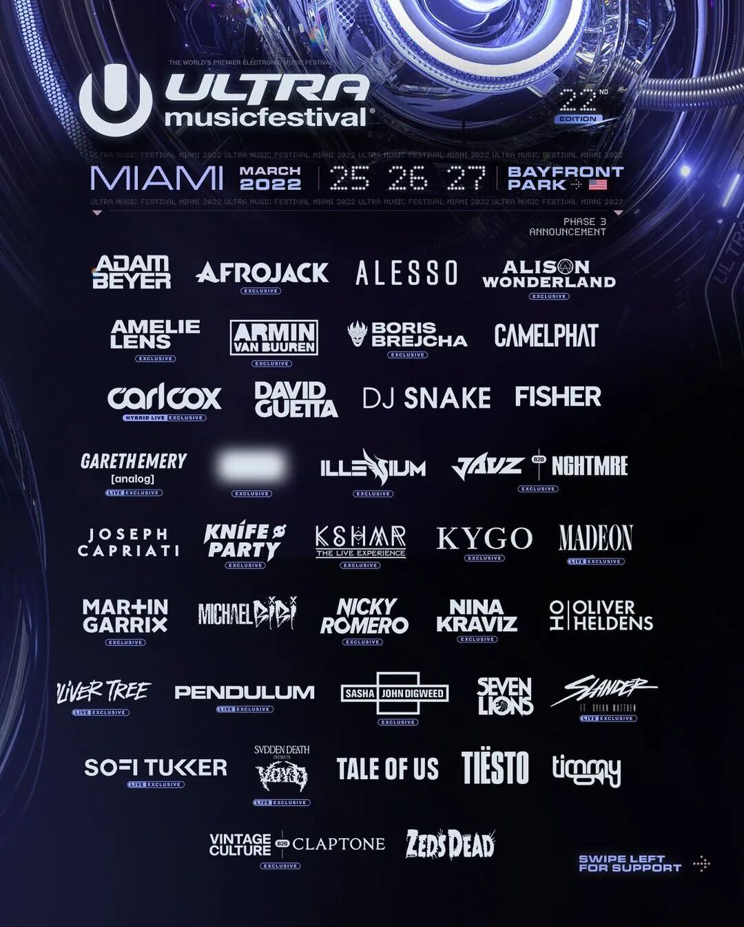 Ultra Miami的艺人阵容通常都是分三批公布,大约在一周前,官方公布了其第三阶段阵容(Phase 3)即最后一批的完整阵容,图中合计200个(左右)艺人及艺人组合,笔者也再次带着读者朋友们熟悉一下更新后的阵容海报。(本文为典型的“伪备用稿”——当日撰毕以“备用”,却在次日就发布了,起到备用效果了但没完全起到)