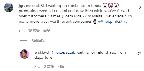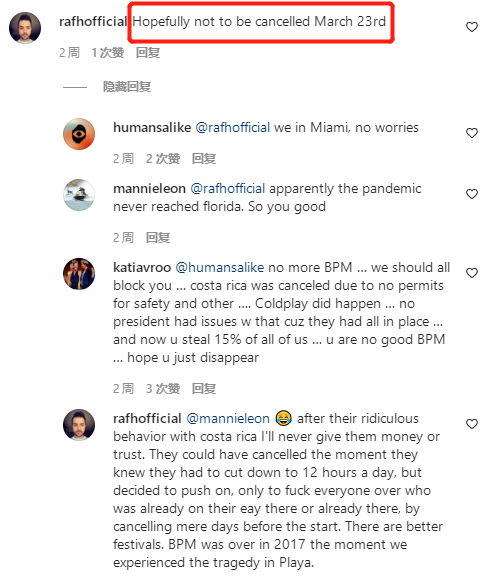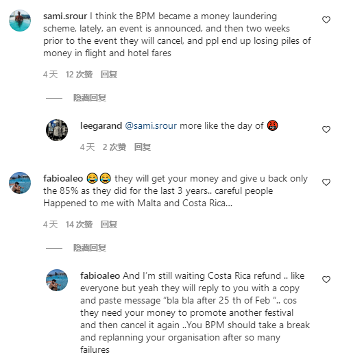 不过电子音乐资讯笔者Taylor发现,大量粉丝们对此都不买账,有人调侃道“希望(The BPM Festival Miami)可别在3月23日又(提前2天宣布)取消了”。因为The BPM Festival Costa Rica并不是第一次取消,并且,今年竟是在举办前两天宣布取消,世界各地的许多Raver们都已经出发、甚至已经到达哥斯达黎加了,他们气愤不已。