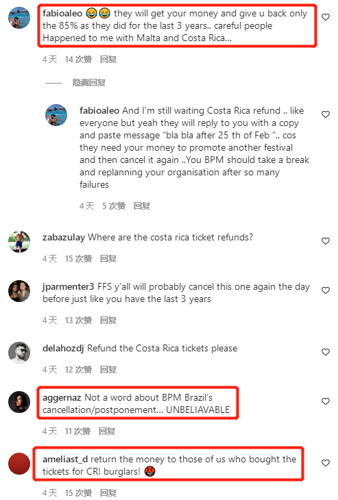 更让The BPM Festival质疑声、骂声一片的是,许多购票者和Ravers并未收到退款,再加上此前原定于今年2月25日至27日的The BPM Festival巴西站也被推迟了,但官方却没有发布公告(据说只发了邮件),众人纷纷将其评判“自导自演”、“窃贼“、抢钱”、“骗局”、“Xi钱”……