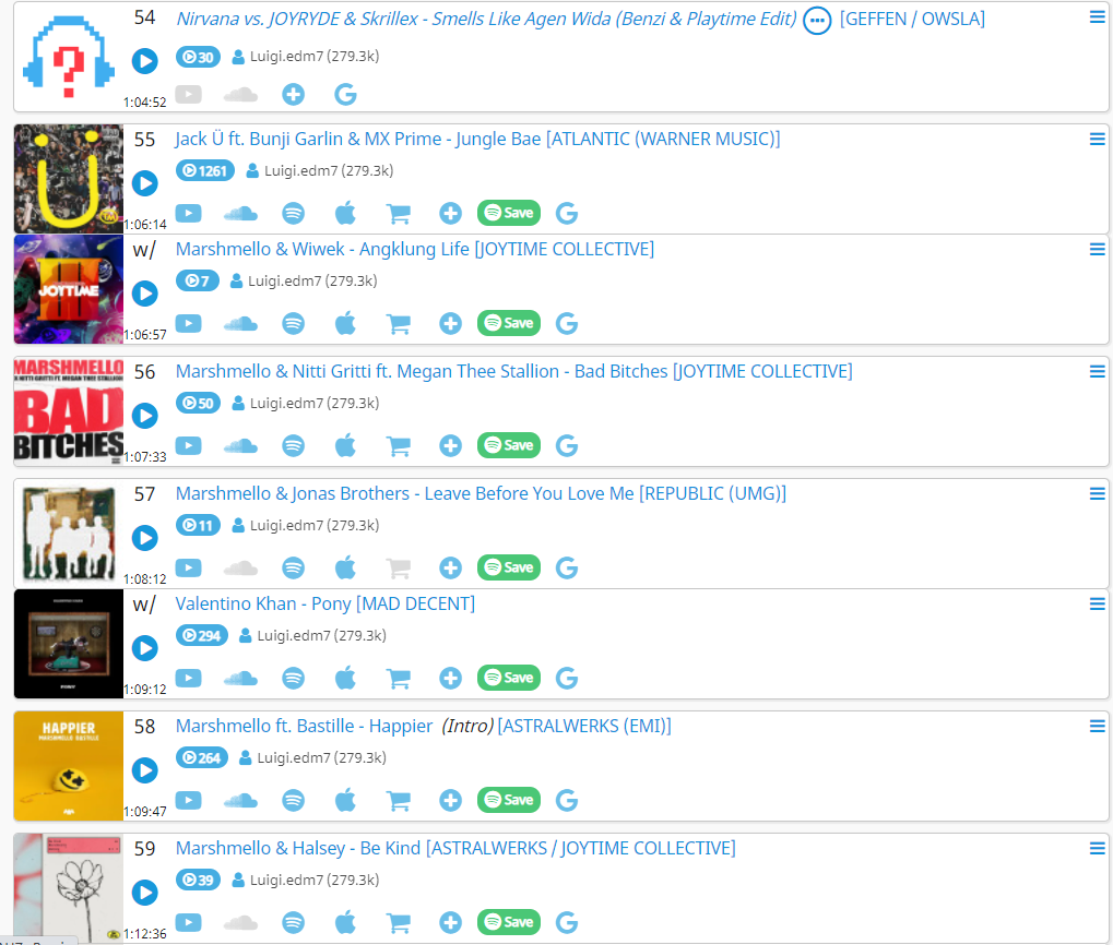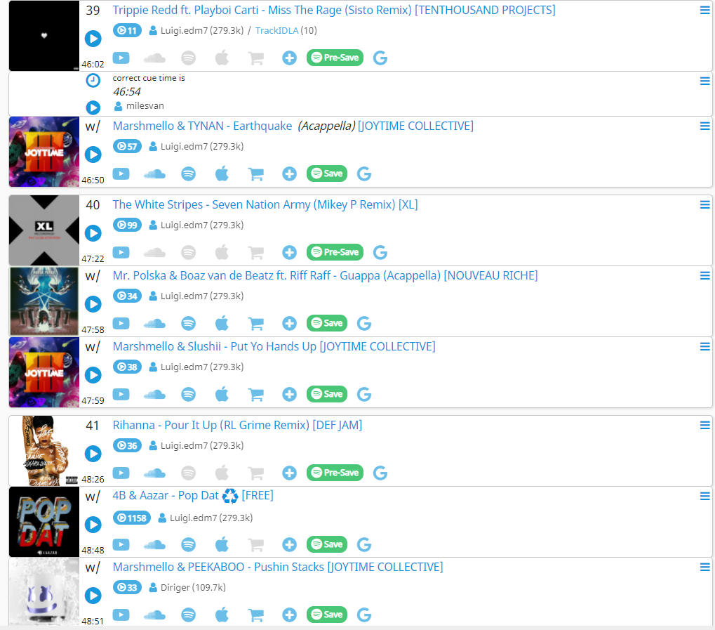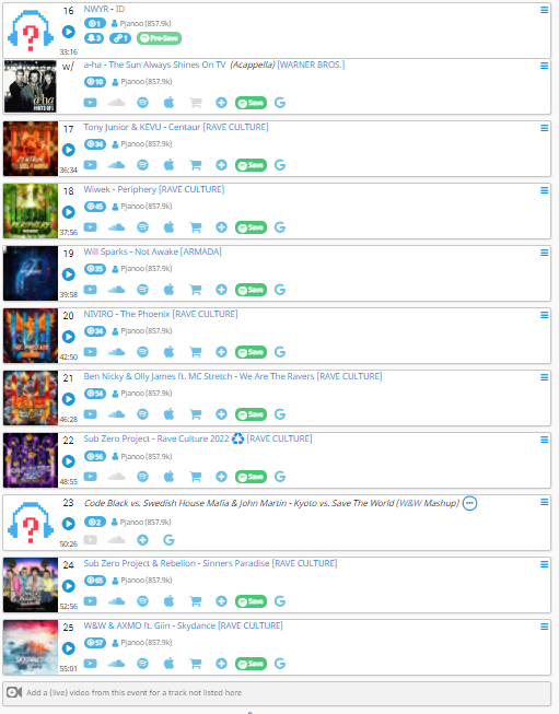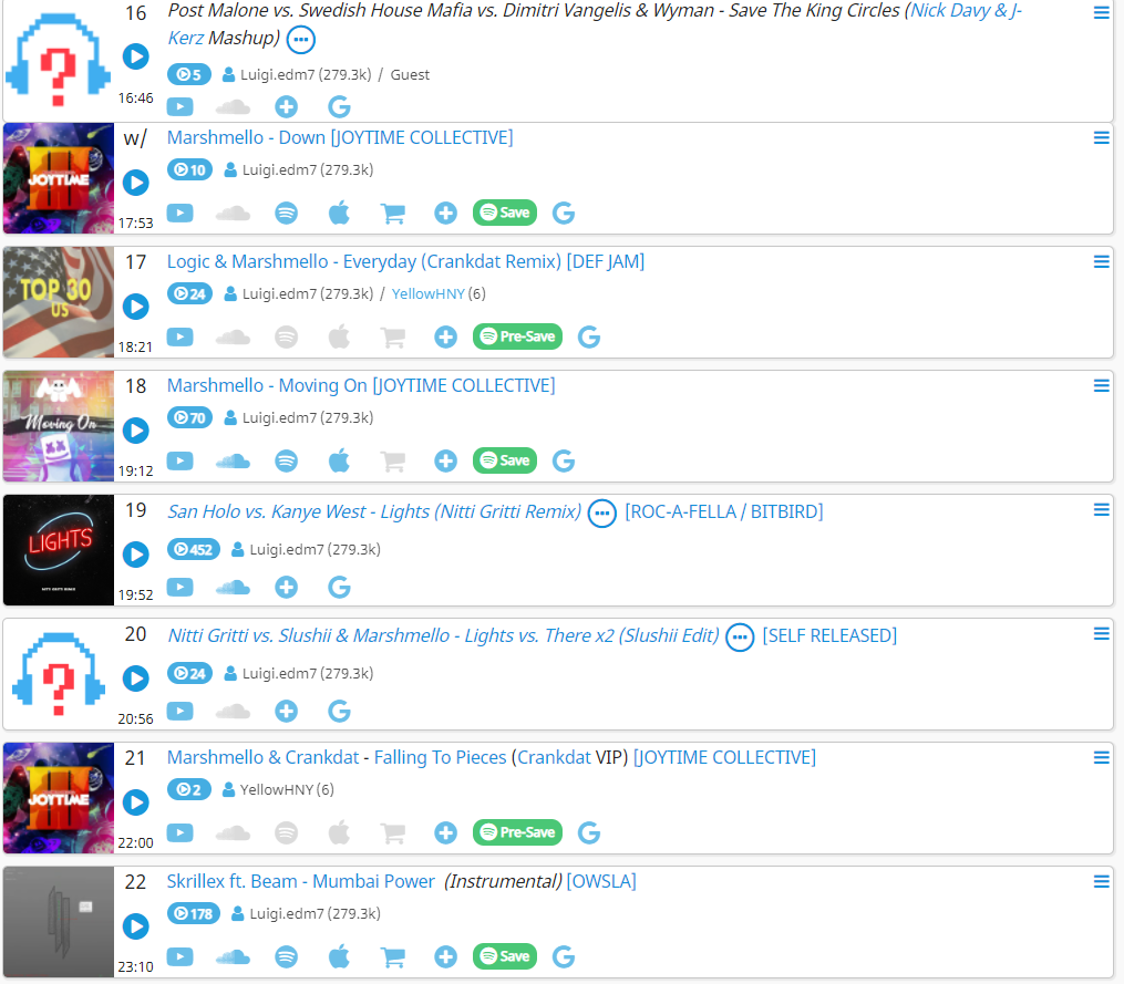 就像本文摘要所“单刀直入”地说道:少数数据对于中国行情来说还算“接地气”,但多数数据相比却有隔阂。无论你是电音流媒体听众、锐舞客还是夜店活跃酒客、舞客,《TOP TRACKLISTS OF 2021》都能像《TOP LABELS OF 2021》那样助(“功”)你脱离尴尬。年度第一名的Tracklist(或者说Playlist,也就是播放列表、打碟的曲目列表)是《Timmy Trumpet - SINPHONY Radio 001 2021-02-26》,这份“歌单”包含的曲目以Big Room House、(EDM's) Electro House为主,并融入了Tech House、其它纯正House,再或者是其它“EDM House” ("House EDM")流派。图片来自1001Tracklists 图片版权属于原主年度老二《Marshmello @ Lollapalooza United States 2021-07-30》,涉及EDM Trap、Future Bass、Melodic Trap、Heavy Dubstep以及近几年Marshmello热衷的曲风,比如新派的Trap Rap(含但不限于Emo Trap、Melodic Rap、Newwave Rap等等)还有多首House Music。总结性地来说,既有以前的“老棉”风貌,又有新版的“老棉”Vibe。图片来自1001Tracklists 图片版权属于原主老三《W&W @ Rave Culture Live 001, Club Mythic Rave Culture City 2021-04-17》的整体风格与Timmy Trumpet相似,是在Yi Qing前(国内外)主流的“各类EDM式的House Music”,尤其是以Big Room House、(EDM's) Electro House为主。