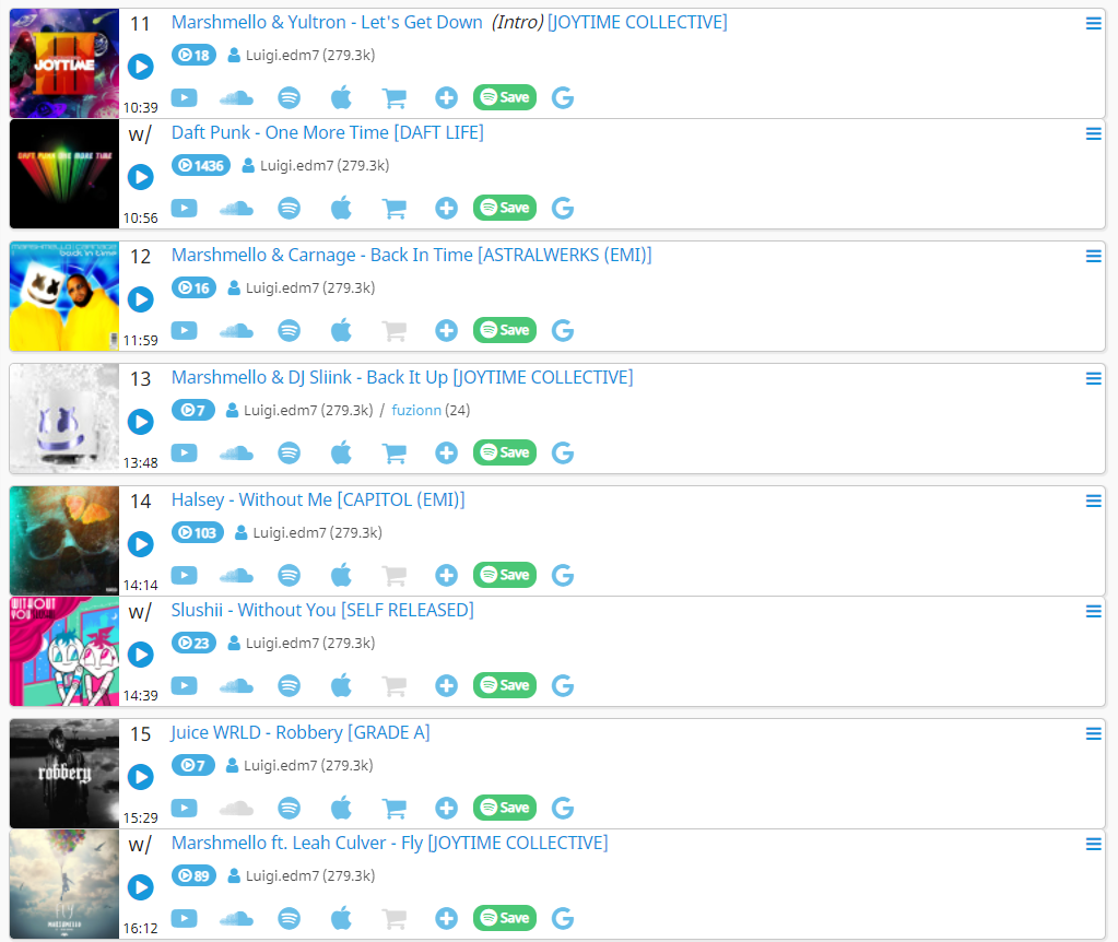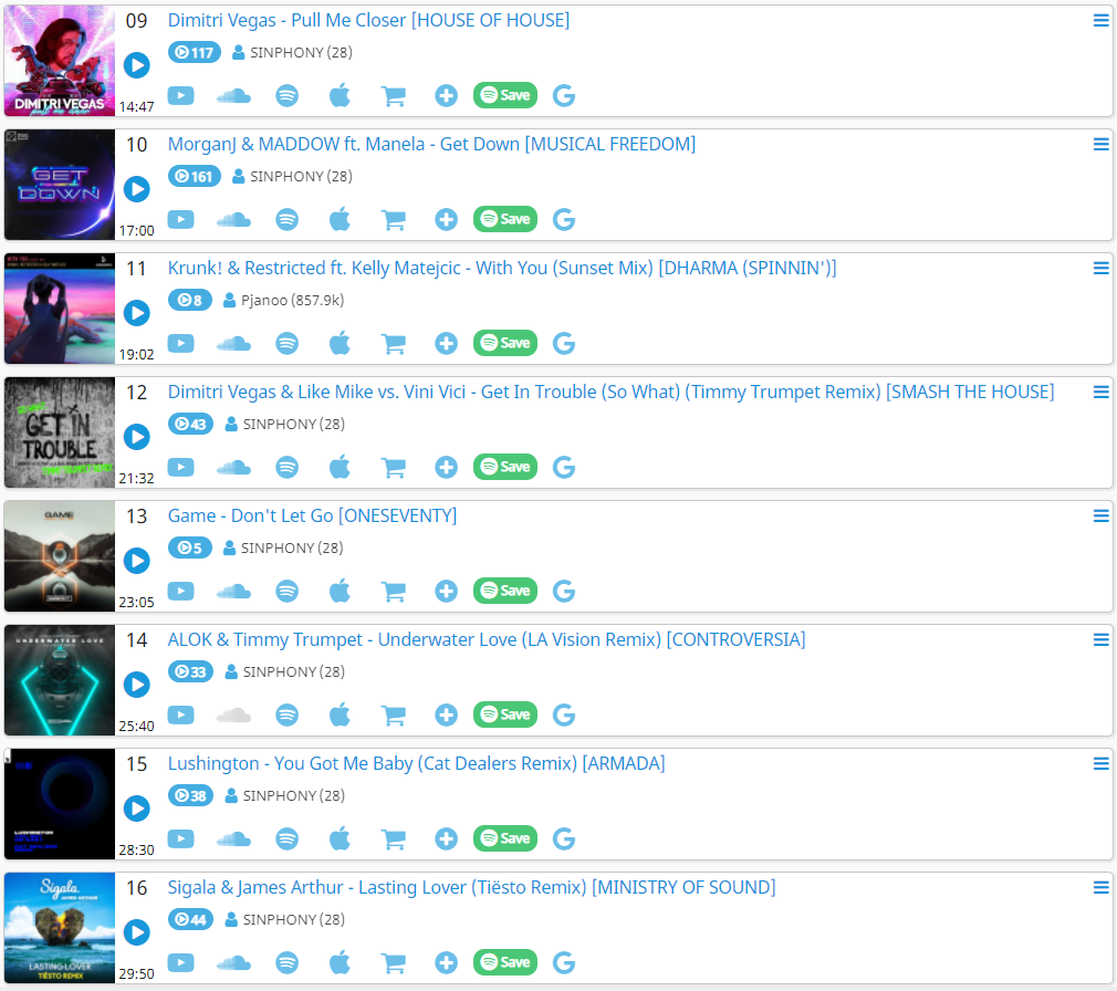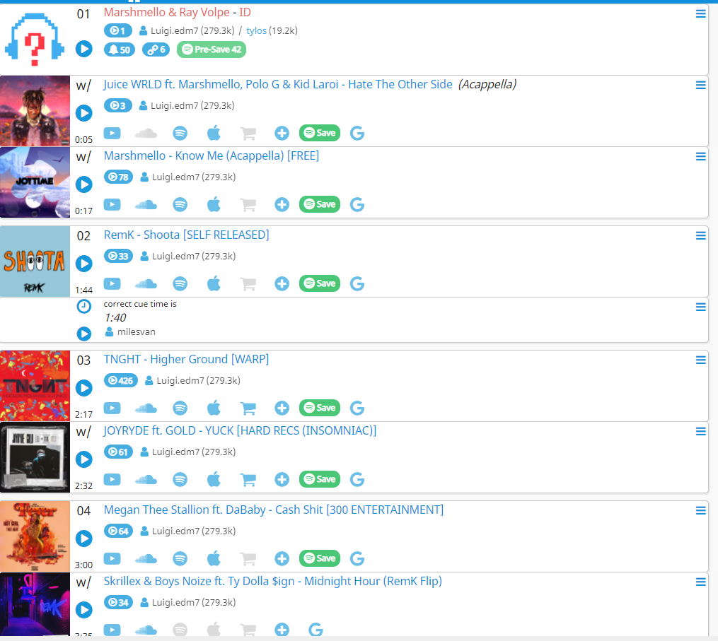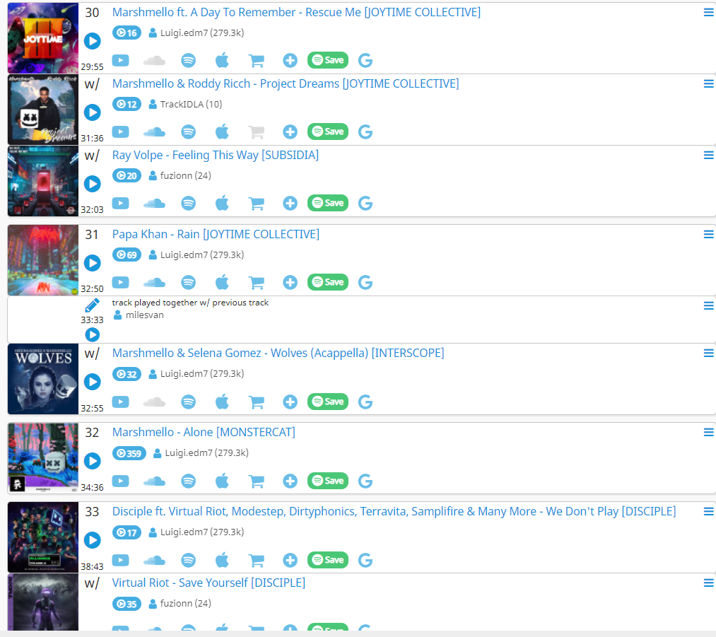 就像本文摘要所“单刀直入”地说道:少数数据对于中国行情来说还算“接地气”,但多数数据相比却有隔阂。无论你是电音流媒体听众、锐舞客还是夜店活跃酒客、舞客,《TOP TRACKLISTS OF 2021》都能像《TOP LABELS OF 2021》那样助(“功”)你脱离尴尬。年度第一名的Tracklist(或者说Playlist,也就是播放列表、打碟的曲目列表)是《Timmy Trumpet - SINPHONY Radio 001 2021-02-26》,这份“歌单”包含的曲目以Big Room House、(EDM's) Electro House为主,并融入了Tech House、其它纯正House,再或者是其它“EDM House” ("House EDM")流派。图片来自1001Tracklists 图片版权属于原主年度老二《Marshmello @ Lollapalooza United States 2021-07-30》,涉及EDM Trap、Future Bass、Melodic Trap、Heavy Dubstep以及近几年Marshmello热衷的曲风,比如新派的Trap Rap(含但不限于Emo Trap、Melodic Rap、Newwave Rap等等)还有多首House Music。总结性地来说,既有以前的“老棉”风貌,又有新版的“老棉”Vibe。图片来自1001Tracklists 图片版权属于原主老三《W&W @ Rave Culture Live 001, Club Mythic Rave Culture City 2021-04-17》的整体风格与Timmy Trumpet相似,是在Yi Qing前(国内外)主流的“各类EDM式的House Music”,尤其是以Big Room House、(EDM's) Electro House为主。