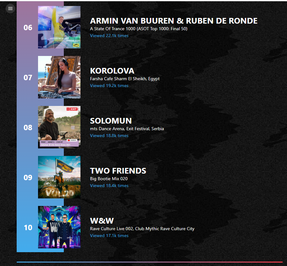 图片来自1001Tracklists 图片版权属于原主第六名的《Armin van Buuren & Ruben de Ronde - A State Of Trance 1000 (ASOT Top 1000: Final 50)》以Trance为主;第七名《Korolova @ Farsha Cafe Sharm El Sheikh, Egypt 2021-04-23》以正版的Progressive House、Deep House和其它正版House居多。图片来自1001Tracklists 图片版权属于原主第八名《Solomun @ mts Dance Arena, Exit Festival, Serbia 2021-07-11》也是各种House Music的天堂,更纯的Deep House、Tech House和Progressive House;第九名《Two Friends - Big Bootie Mix 020 2021-10-25》与第五名的听感区别不大;榜尾《W&W @ Rave Culture Live 002, Club Mythic Rave Culture City 2021-07-24》与第三名的听感区别不大。