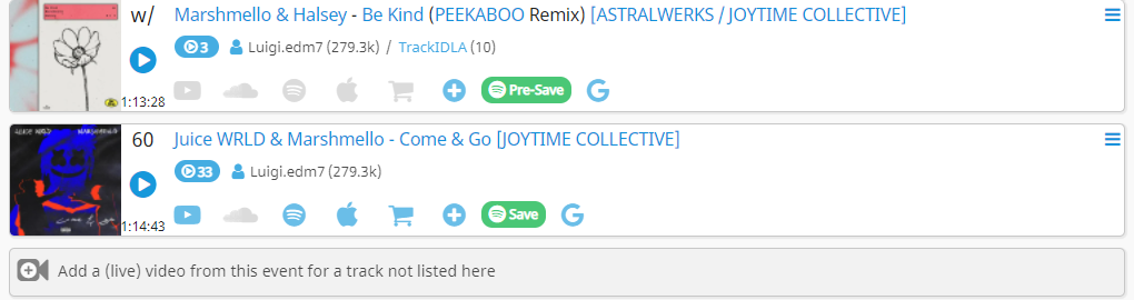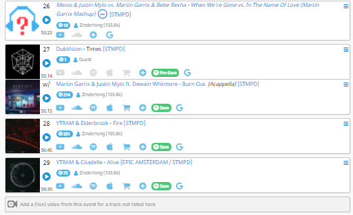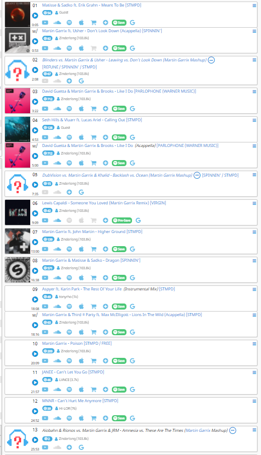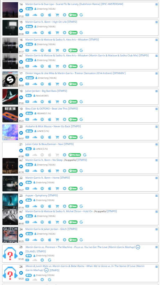 图片来自1001Tracklists 图片版权属于原主第四名《Martin Garrix @ Melodia Stage, Tomorrowland NYE Edition 2020-12-31》与老三、老大的曲风类似,都是各类EDM“行情”下的商业House,但有区别,Martin Garrix的曲目列表包含了更多的Future House和Bass House。