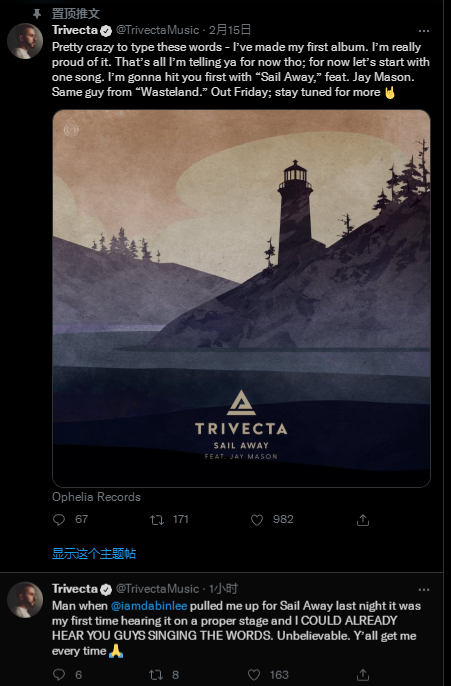 近日,Trivecta发布帖子上表示,他因完成第一张专辑的制作而感到激动,这张专辑涵盖了他要告诉粉丝、乐迷的全部内容。本月18日,Trivecta发布了该专辑(当中、“先行曲”)的第一首曲目《Sail Away (feat. Jay Mason)》。图片来自Trivecta Twitter截图 图片版权属于原主