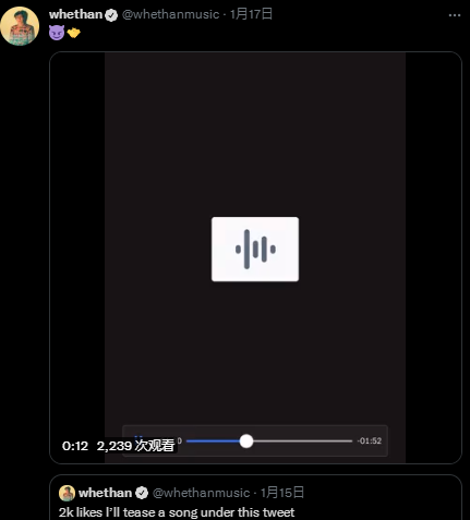 不过,Ethan Snoreck还是比较淘气,无论是这首音乐还是帖子的字里行间都充满着“孩子气”。他说该Twitter帖子要集满2000个赞才发布该曲目,然而目前赞的数量还远远不够,这样下去不知需等到猴年马月能够发行。喜欢的听众朋友可以去“推上”支持一波,“众人拾柴”集赞快,也许他明天就会发布(理论层面,实际上的分发商发行通常至少需要14天及以上)了。图片来自Whethan twitter截图 图片版权属于原主