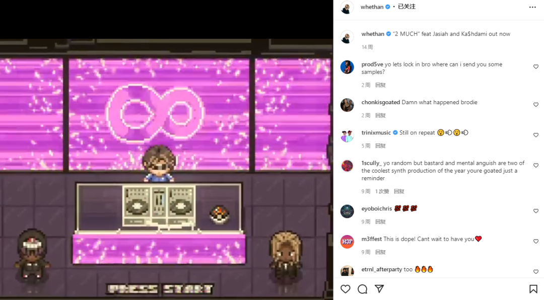 不过,这位(曾)患有身心问题的小鲜肉上个月通过发布片段再次引起了海外电音媒体的注意。近期他又在做一首新歌,与Ethan Snoreck/Whethan之前的两张专辑《Fantasy》和《Life Of A Wallflower》的风格截然不同。如大家所听到的,Whethan在Twitter上发布了一段音频片段预览,显然这首是一首摇滚音乐与电子音乐的跨界作品,同时在后者的Trap曲风结构上融入了Chiptunes元素,“像素音乐”,8-Bit、游戏音乐的听感以及水滴声带着笔者回到美好的童年时光。图片来自Whethan Instagram截图 图片版权属于原主