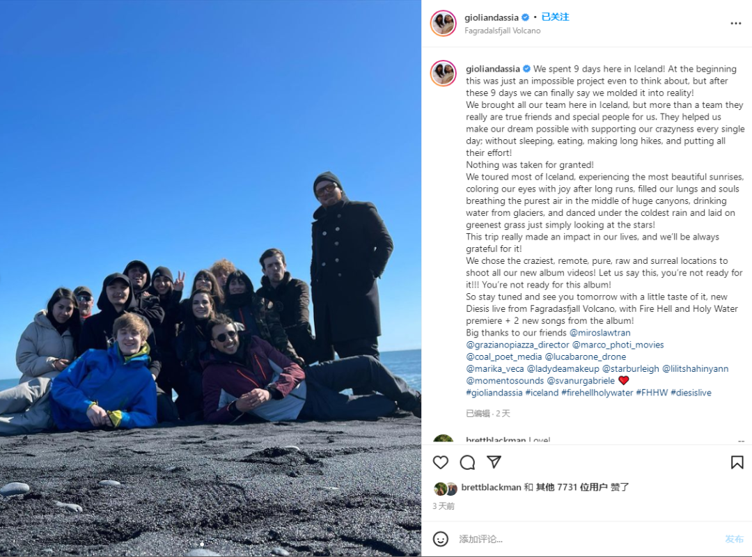 对此次表演,Giolì & Assia发文表示,来冰岛工作、旅行的不只是两位成员和摄影师们,更有视频导演、化妆师、造型师等整个的团队成员,确切地说,这不仅仅是一个团队,而是一群志同道合的朋友,来火山上表演、一起疯狂。