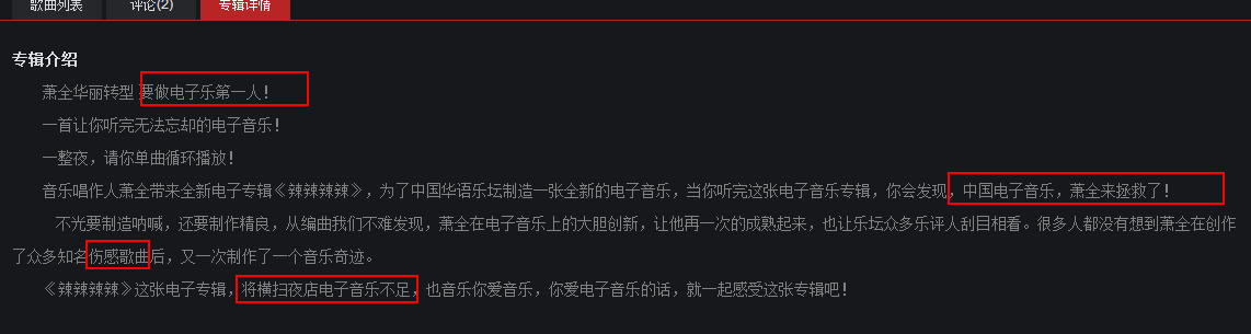 听萧全的粉丝说,他们只认为这首歌好听,其它的都不喜欢。也难怪他除了这首歌有上千条评论以外,其实都只有十条到几十条。在土嗨眼中这绝对是最好听的一首电子音乐,因为他们到处用这首歌秀优越感。对各种电音爱好者说“你听的歌还没有这首好听”。