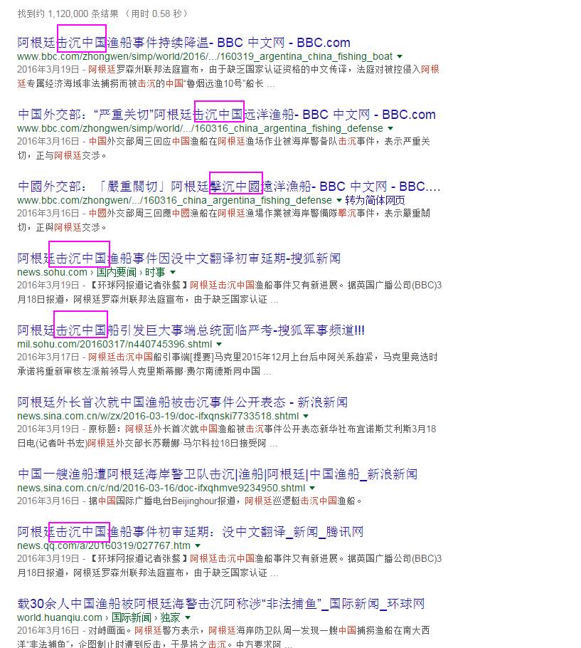 毕竟阿根廷击沉中国渔船这起事件就是3月份的事。这个词频也不是现在才刷上来的。哦对了,我刚才用搜狗输入“阿根廷击沉”的时候也补充了中国,那是不是搜狗也要“击沉中国”呢: