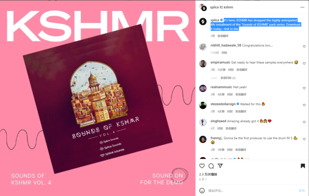 2022年6月1日(部分平台为2022年5月31日),Sounds Of KSHMR Vol. 4正式在Gu Ge权重极高的素材包网站Splice Sounds(或者简写为Splice)发行,Dharma Worldwide官网的销售价格为99.99美金、会员折扣价为79.99美金,中国折扣价为免费传播的盗版No.1。