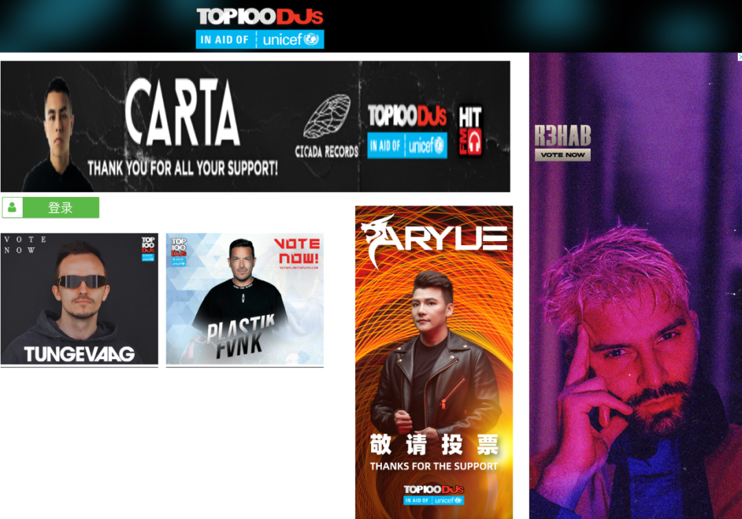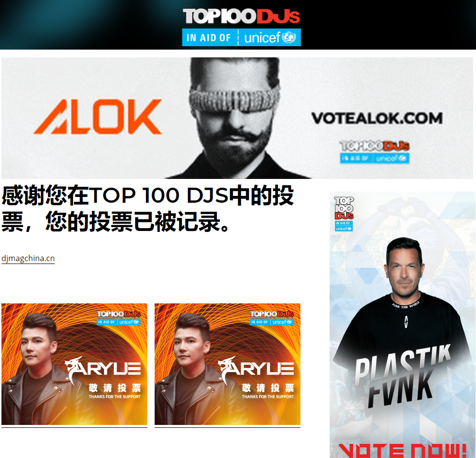 打开DJ Mag Top 100 DJs的官方投票网站,我们会发现DJ Mag为中国乐迷开通了特殊通道“中国用户登录”,当然,考虑到中国乐迷群体的庞大数量这也是情理之中的。点击进入下一步之后,国内的DJ/制作人——Aryue映入眼帘。