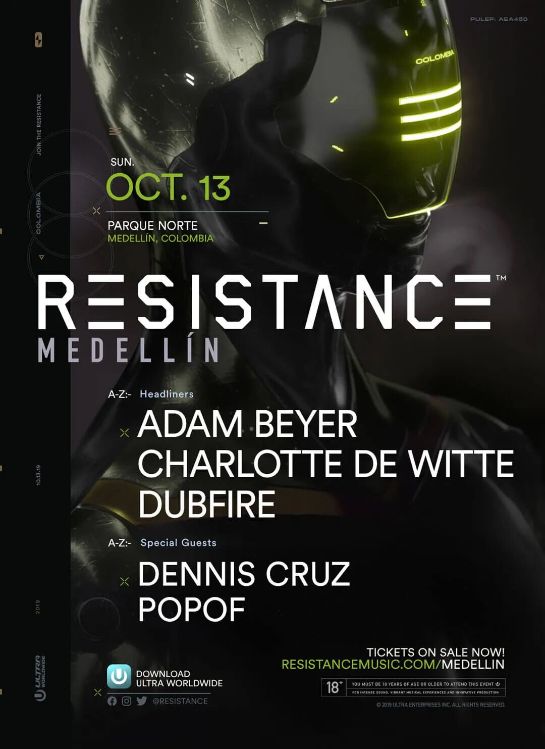 2017年,Resistance第一次以独立音乐节的形式、而不是舞台的形式,落地哥伦比亚第二大城市麦德林(Medellin),以其单日、单舞台的“独立魅力”呈现6位/组现代Techno(铁克诺)或正统House(浩室)音乐界享有数十万至数百万粉丝流量以及美誉的新老明星DJ/制作人。