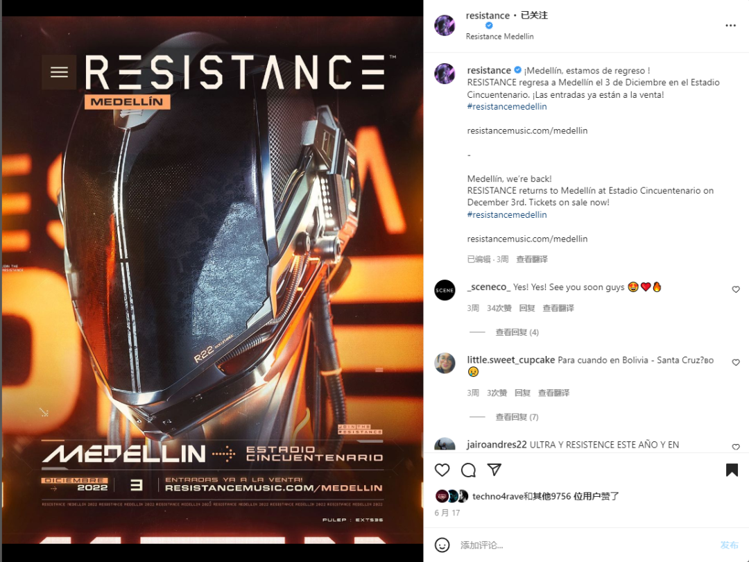 2020年和2021年,因为Xin Guan Yi Qing的影响,Resistance Medellin没能落地;但,就在不到一个月前(较撰文时间,20多余),Resistance官方宣布Resistance Medellin正式回归,举办日期为12月3日,这不比博人传还燃?