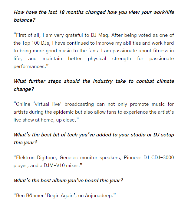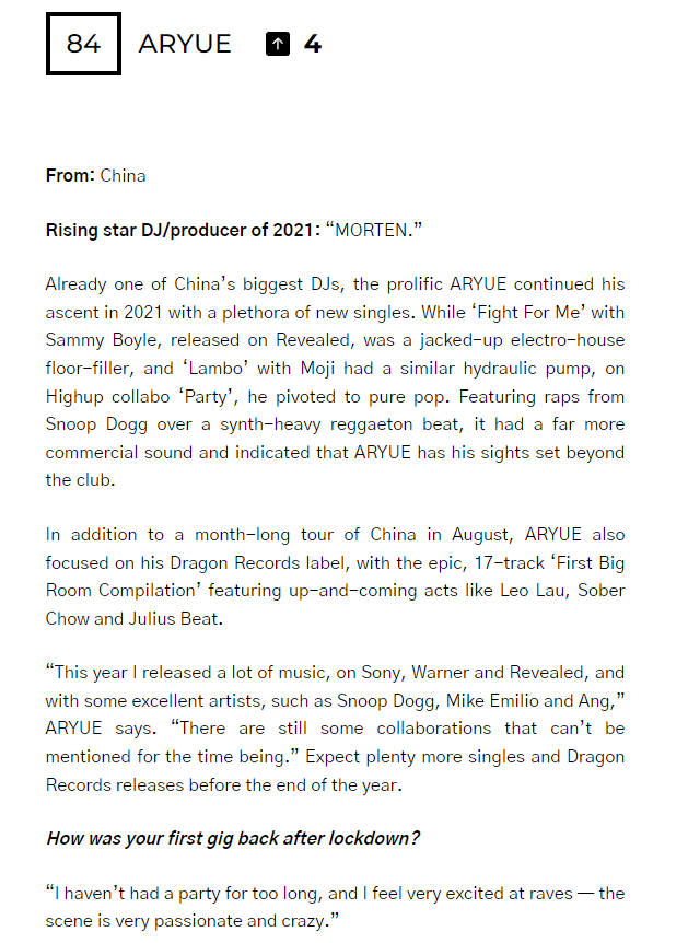 2021年Aryue不仅没有因为舆论压力下调排名,反倒上升了4个名次,取得84名的成绩。而在DJ Mag百大DJ榜单的采访中,Aryue也透露出了自己频繁地与艺人、厂牌、俱乐部进行合作的细节,Cue到了他喜欢的艺人、曲风、经历等方面,不禁又让人回忆起他的国际履历以及与国内大咖们的交集。