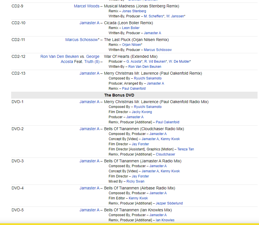 海外艺人呢?我们也不需要举例子了,既然一开始就“Cue”到了DJ Mag百大DJ排行榜,我们就试着再去这张榜单上把前二十的艺人搜个遍,几乎都是“Collab常客”、“Feat.神王”、“Credit巨魔”;只有到排名靠后的一些Techno和House上榜者才喜欢单打独斗。