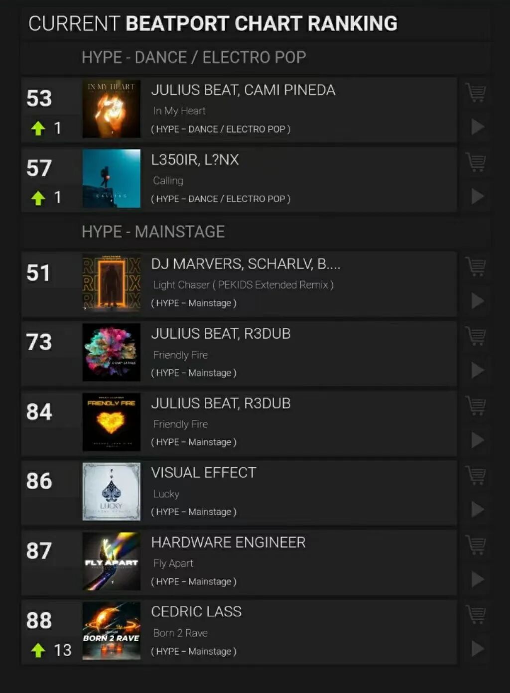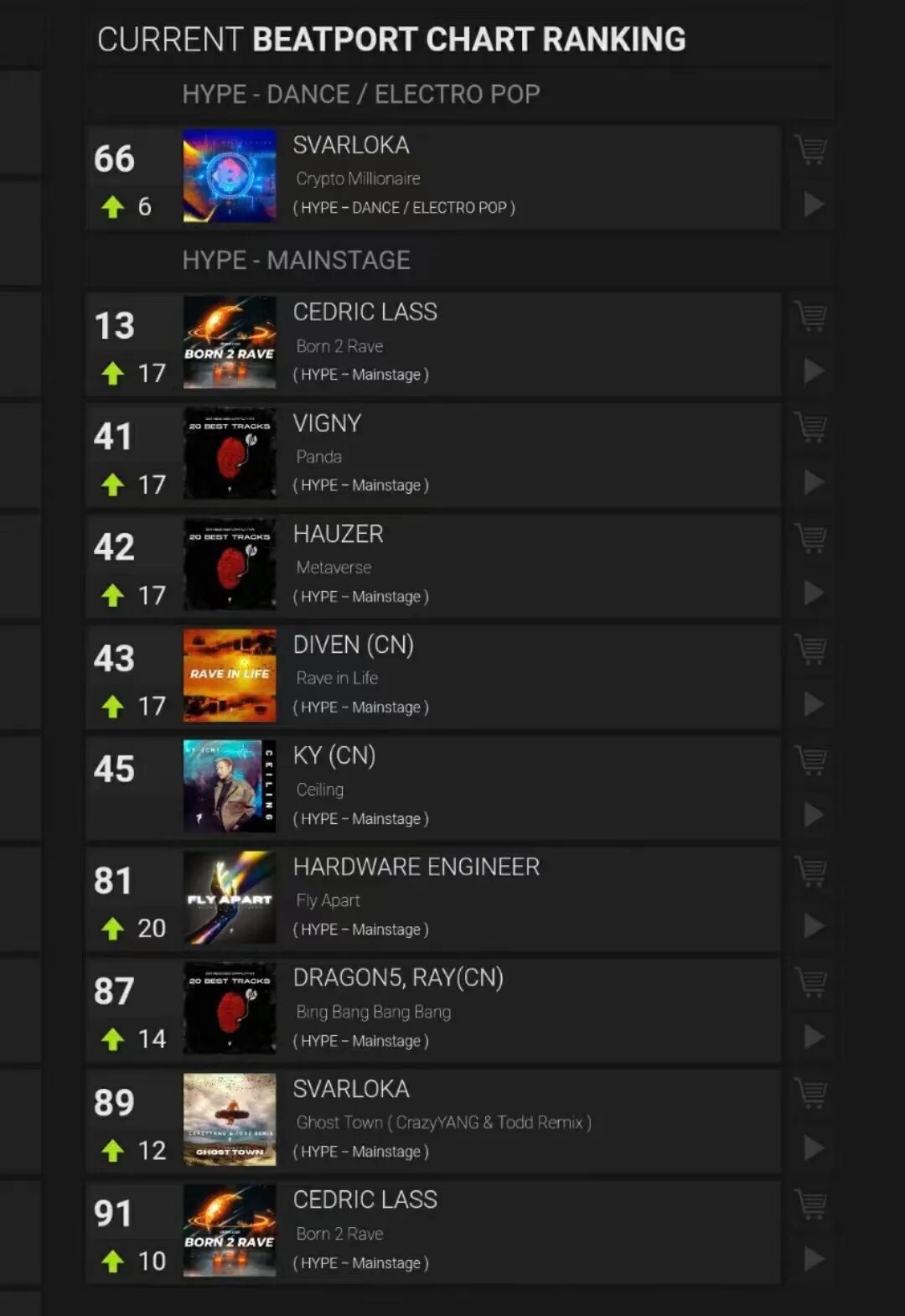图片来自Dragon Records 图片版权属于原主…Nigo、Manson、Cédric Lass、KY、Dj Bear、Scharlv、Simon、Dragon5、FF、Julius Beat、Crubbixz、Tank、Jamaster A、Aryue、ZYT、Yushu、R3dub、DeshRoane、DJ Marvers、CrazyYang、HOTXIANGG、Skipper、DJ Coffee、Kisos、Ashilin、7DAYS、ChAn.、Jel7yz、W.raiNbow、Bob Hou、Axer……图片来自Dragon Records 图片版权属于原主听舞曲、放舞曲的朋友们肯定都很熟悉Beatport吧。根据Beatstats的数据记载,Dragon Records是唯一一家在Beatport上登上且多次登上“百大厂牌”列表的中国Label,他们的许多音乐是为舞曲下载提供服务的;通过Beatstats,几乎Dragon Records的所有作品都能查询到在Beatport的排名,进入Hype-Dance和Electro Pop前百位的作品如下一直存在。图片来自Beatport | Beatstats@Dragon Records 图片版权属于原主就近几年,Dragon Records在Beatport上的“发育”非常成功,也不止一次论证中国电子音乐在国际流媒体中能够收获出乎寻常的成就。而这一切除了主要经理人Julius Beat的运营外,自建厂牌、管理层和经纪公司的Aryue也总是在帮助国产电子音乐曲目出现在海外舞池。为Aryue在DJ Mag的榜单投上一票,支持他的国电出口工作。