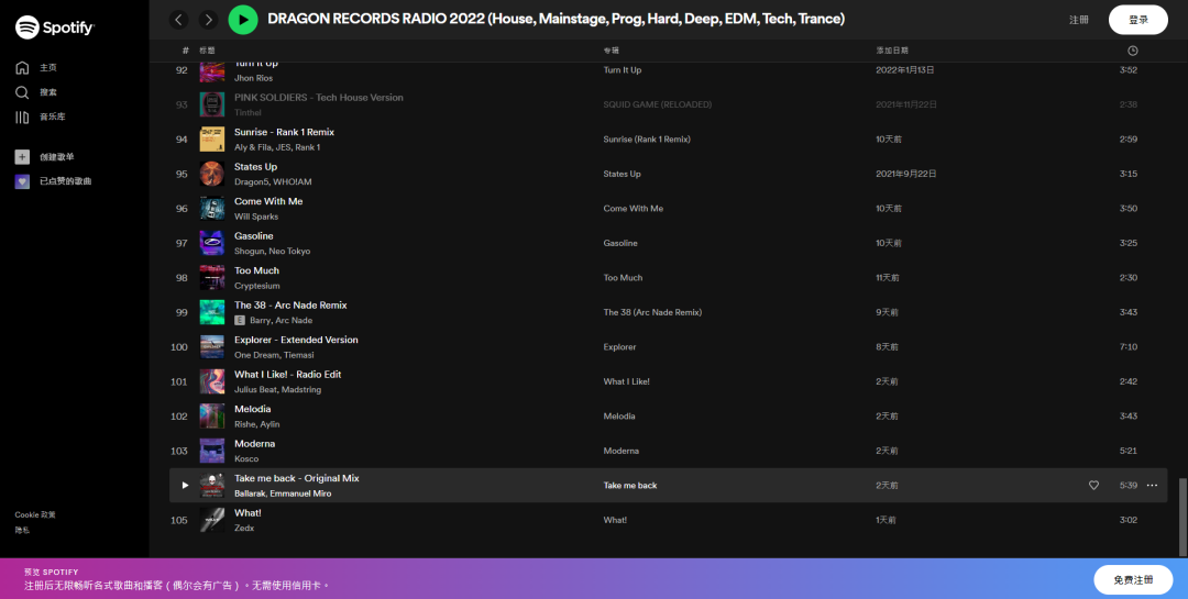 图片来自Spotify截图@Dragon Records 图片版权属于原主2019年3月,DJ Mag百大DJ排行榜上榜者Aryue与厂牌经理人兼联合创始人Julius Beat创立了Dragon Records,并利用他们行走DJ/制作人/Manager业内的丰富资源吸引了国内外诸多艺人前去投稿、发歌(实体的、非Net-Label的),这里说的发歌自然不仅限于电台。图片来自Dragon Records 图片版权属于原主Dragon Records的不少作品在1001tracklists也被收录,且有不少作品被DJ Mag百大DJ支持,Julius Beat和Aryue并不是唯独的受益者。在过去两年之间,Dragon Records发布过了超过300支作品,其中就有数十首曲目在流媒体排行榜和DJ演出列表中脱颖而出。图片来自1001tracklists截图@Dragon Records 图片版权属于原主Dragon Records在过去三年的时间里与近60位DJ/制作人进行了签人(艺人约)或签歌(厂牌约)的合作,其中有90%以上的艺人来自中国本土。这些艺人包括而不限于:Han$、Witch C、Zedx、Iso7I、Max Roven、Saxaq、MarshallYU、Hauzer、Leo Lau…