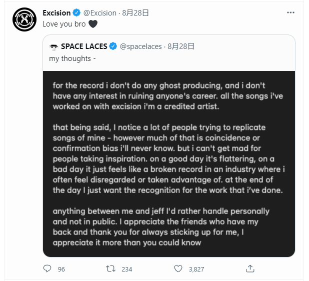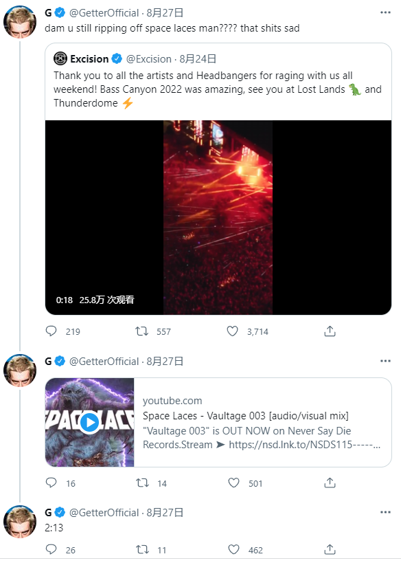 美国时间2020年8月27日,即撰文的半周前,Getter在推特上指责Excision“至今还在抄袭Space Laces”,还紧随其后地放出了他“认为”的“原曲”——《