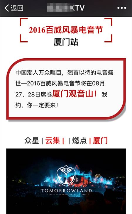 很明显这个音乐节的名字是“百威沙滩电音节”,而到了这家诈骗KTV那里却称之为“百威风暴电音节”。这里故意混淆两者概念并且将音乐节噱头化十分明显。好比我说要送你一台iphone7,事实却送了你一台红米,他们想要的目的就是这样。