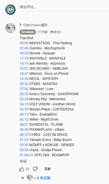 (说明一下,两期例曲Continuous Mix里面,有不少曲子是House Drift Phonk或者原始嘻哈Drift Phonk的子类型,并非每一首都是纯House Drift Phonk,其第二期视频包含的子类型比例更高)