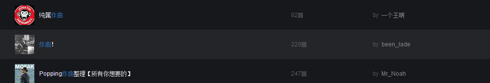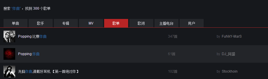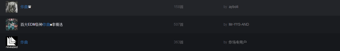 那么我们来看看这些被错误叫成“炸曲”的“音乐风格”实际上是什么。我们从网易云里搜索几个歌单来尝试证明一下是否真的有“炸曲”这种类型的存在。搜索起来是有大量将一些音乐称之为“炸曲”的歌单: