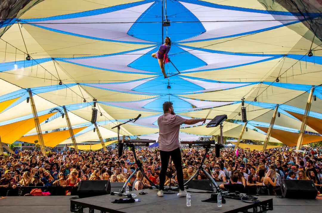 图片来自《超感星电音》截图 | 喜力®星电音 图片版权属于原主其实电子音乐的无穷可能性并不只体现在《超感星电音》,让我们“走”到线下瞧瞧。像Coachella这类音乐节、艺术节往往也会包含各式各样的电子音乐流派(尤其是对Live Set的包容性,比如不会要求跳舞音乐创作者只能打碟);一些传奇的乐队也在这里将合成器应用到摇滚、流行等音乐,制造出了无数令人拍手叫绝乃至震撼一生的表演。