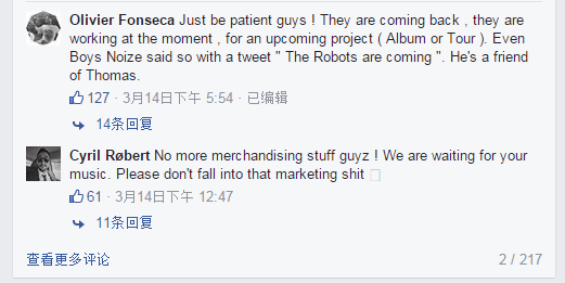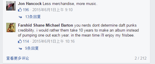这些看似恶意极强的攻击,其实也都是粉丝,他们都喜欢Daft Punk的音乐。所有人都在等着他们发行新专辑,我希望这张新专辑可以惊艳全世界。根据媒体所说,2017他们会有新专辑发行。如果是真的,这是他们酝酿了三年的作品。如果是假的,我会花更多的时间去等这张新专辑。
