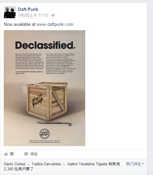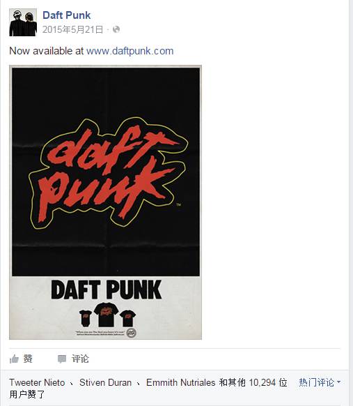 亲爱的Daft Punk,我们爱你的商品,但是更爱你的音乐。我们还想再见到你。我们希望在你们演出的地方购买海报和T恤。肃然起敬。