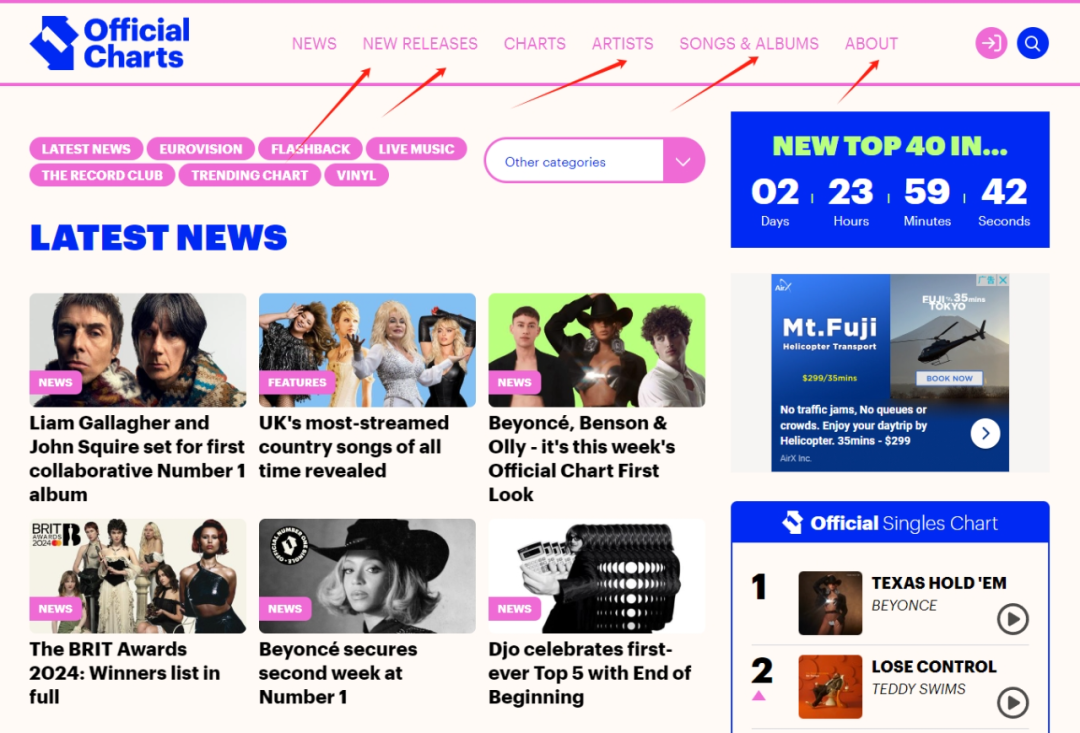 与大部分媒体一样,Official Charts Company长期更新着新Wen、新歌发行推荐、艺人专栏、歌曲和专辑专栏等等媒体事宜,并不是只做UK Singles Chart。如下图。