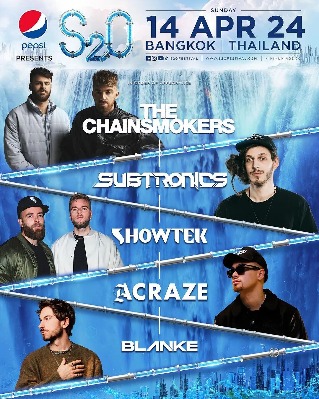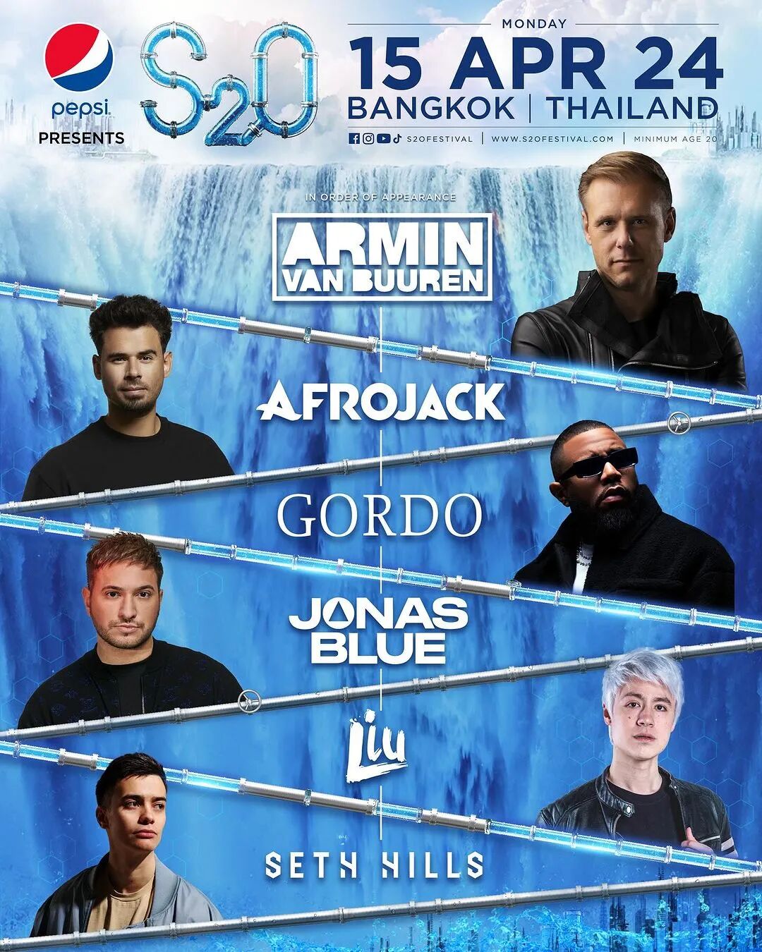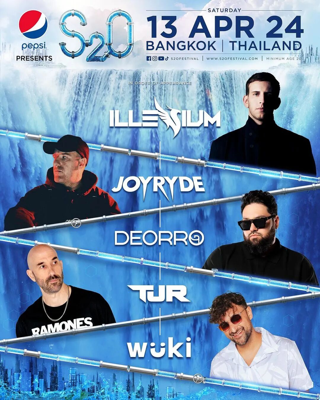号称全球“最湿”音乐节的S2O Songkran Music Festival亦可缩写为S2O Festival,首次落地于2015年4月,并坚持在每年4月泰国曼谷举办,由Pepsi(百事)作冠名主办方,以强大影响力冠名举办、呈献和支持之下,S2O成为泼水节的代表性目的地(之一)。看到Pepsi Pres. S2O泰国站4月的阵容了吗?期待其它分站的惊喜!如今,S2O不仅成为了世界最大的泼水节活动,亦是泰国人气最高的EDM音乐节、电音节IP之一,以其每年吸引数万亚洲不同国家的Ravers为基石,而逐步走出泰国国门,从而在日本、韩国、中国台湾省陆续落地。