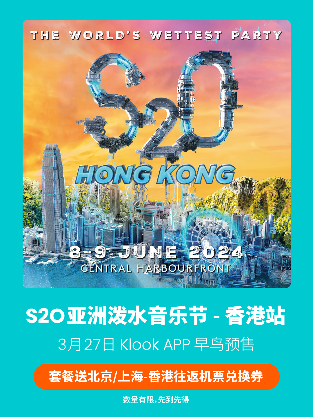 2023年,S2O又被冠名主办方Payme带入中国香港市(特别行政区),巅峰呈现,以国际顶尖DJ/制作人/Artist卡司阵容、强劲喷水装置、独特泼水节体验、精美舞台效果为卖点和亮点,吹响国际著名电音节的“维京号角”。视频来自Klook | S2O Hong Kong 视频版权属于原主2024年6月8日及9日,仍由Payme冠名举办、冠名呈现的S2O Hong Kong将再次上演!占地面积达36000平方米的中环海滨活动空间将再次成为数万人的当下首要选择。同享4月份的世界最大水战,以泼水象征洗去厄运,迎接新开始。图片来自Klook | S2O Hong Kong 图片版权属于原主随着中国近几年音乐产业高速发展,中国港澳台和中国内地纷纷出现了很多顶级的音乐节,且不仅限于电音节、EDM音乐节,不过S2O Hong Kong带来的体验依然会是非常独特的,如今在中国独一家泼水“湿身”装置和泼水节互动氛围会将只可回忆不可言传的Rave体验放大,将你进入Live Rave Festival的另一高度,去过遍在回忆中。图片来自Klook | S2O Hong Kong 图片版权属于原主两日内,活动间,S2O Hong Kong 2024将升级“声光水”(这里不是“声光电”哦),促进更震撼的视觉效果,采用360度的强劲喷水装置,提高阵容当中的DJ/制作人/明星分量,让我们在第一刻整装待发,因为第一波票务及机酒套餐现已袭来。