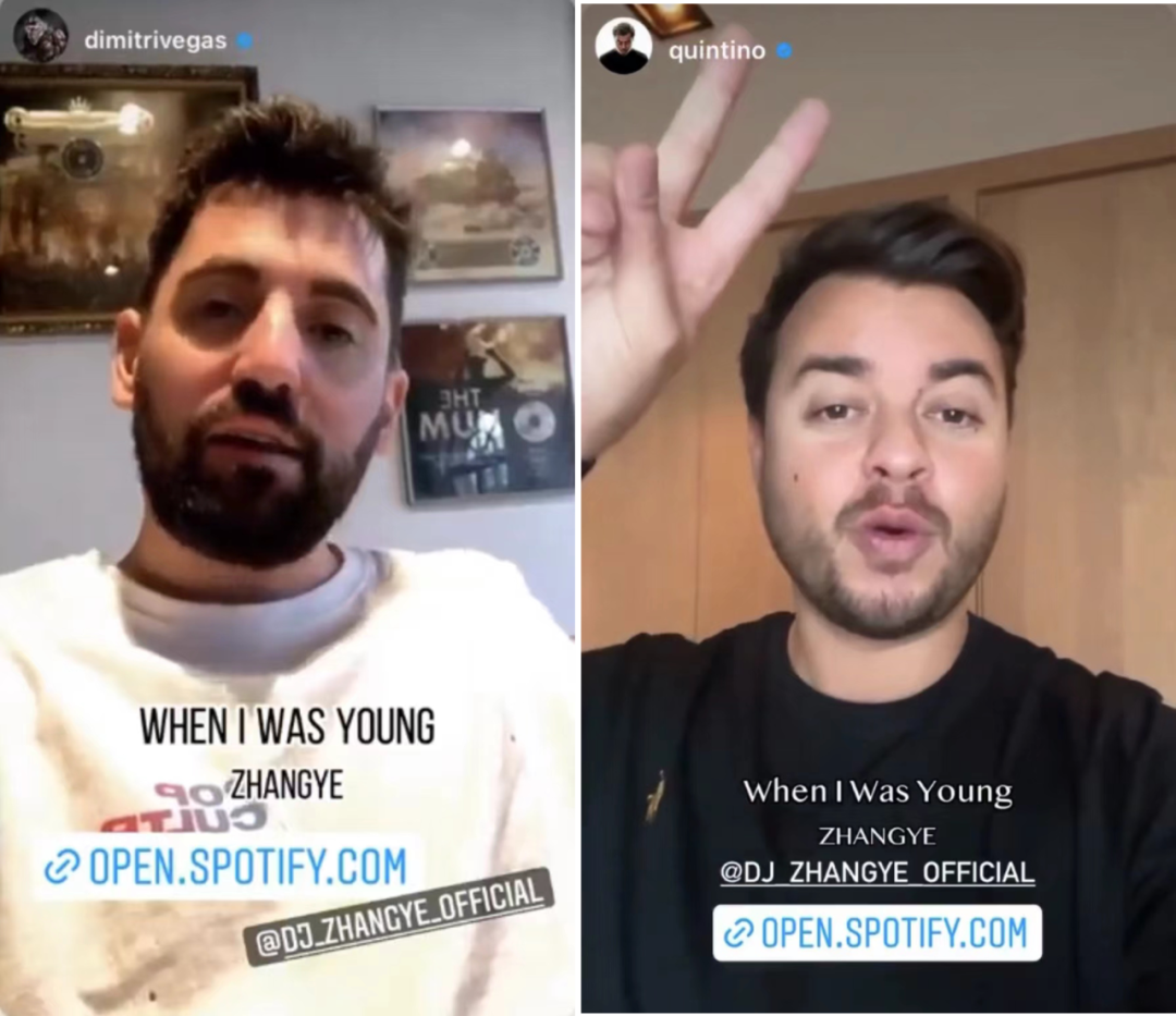 想当“年”,在ZHANGYE发布《When I Was Youg》时,DJ Mag百大DJ排行榜上的Charts顶流EDM之星,Dimitri Vegas和Quintino也在Instagram等社媒上Shout Out了ZHANGYE。