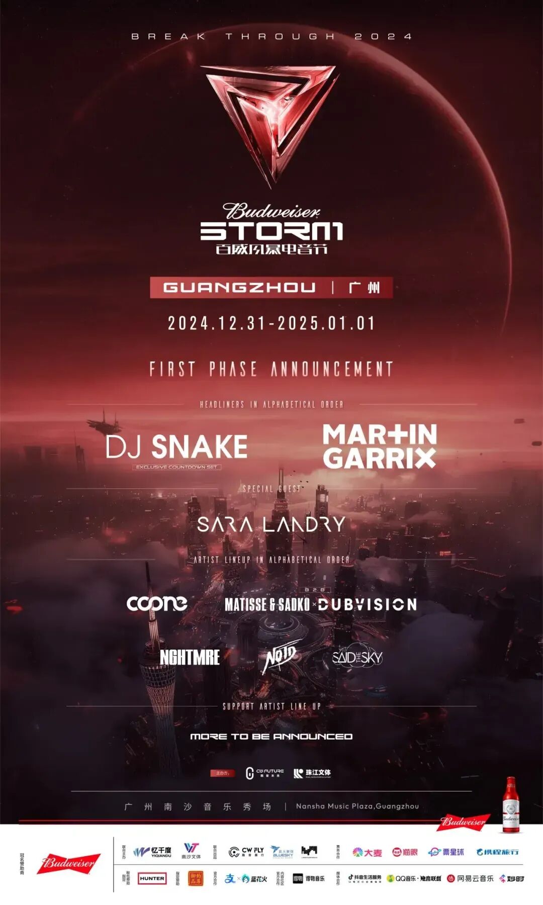 就在写作的昨日(2024年11月25日),风暴电音节官方账号陆续官宣了“百威风暴电音节广州站,开启2025新年狂欢之旅”的首批阵容,值得注意,这只是首批阵容,后续还有很多惊喜。所以,谁说这阵容不好的?这阵容可太棒了。