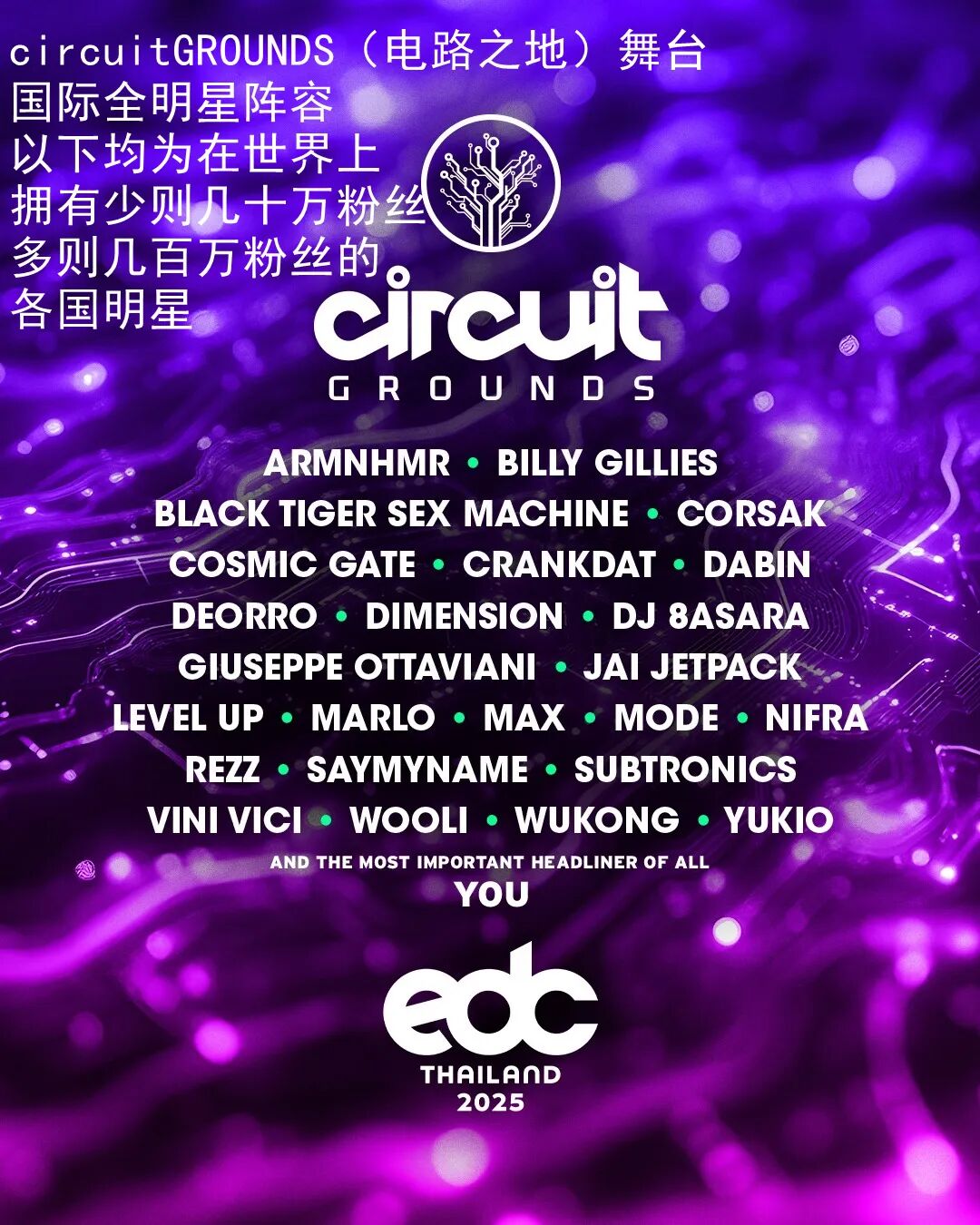 新IP EDC Thailand出现于2024年,首届EDC Thailand将在2025年举办,明年的“泰E”包含四个舞台,主舞台kineticFIELD(动能场)、由Bassrush(贝司劲爆冲冲冲)和Dreamstate(梦想之州)接管的circuitGROUNDS(电路之地)、由Factory 93(93年工厂仓库)和Basscon(贝司加农炮)主持的stereoBLOOM(立体声布鲁姆),以及巡回全球的收音机舞台boomboxARTCAR(噪音盒艺术巡回车)。