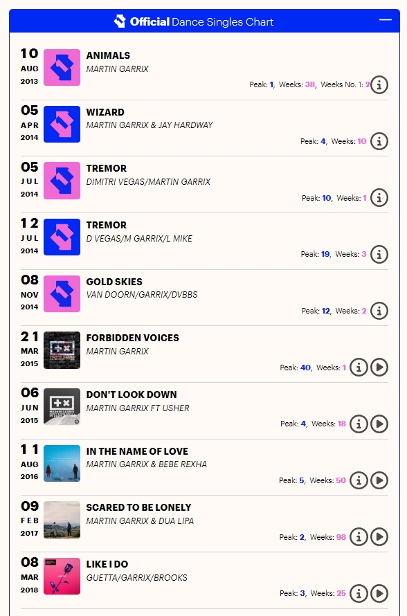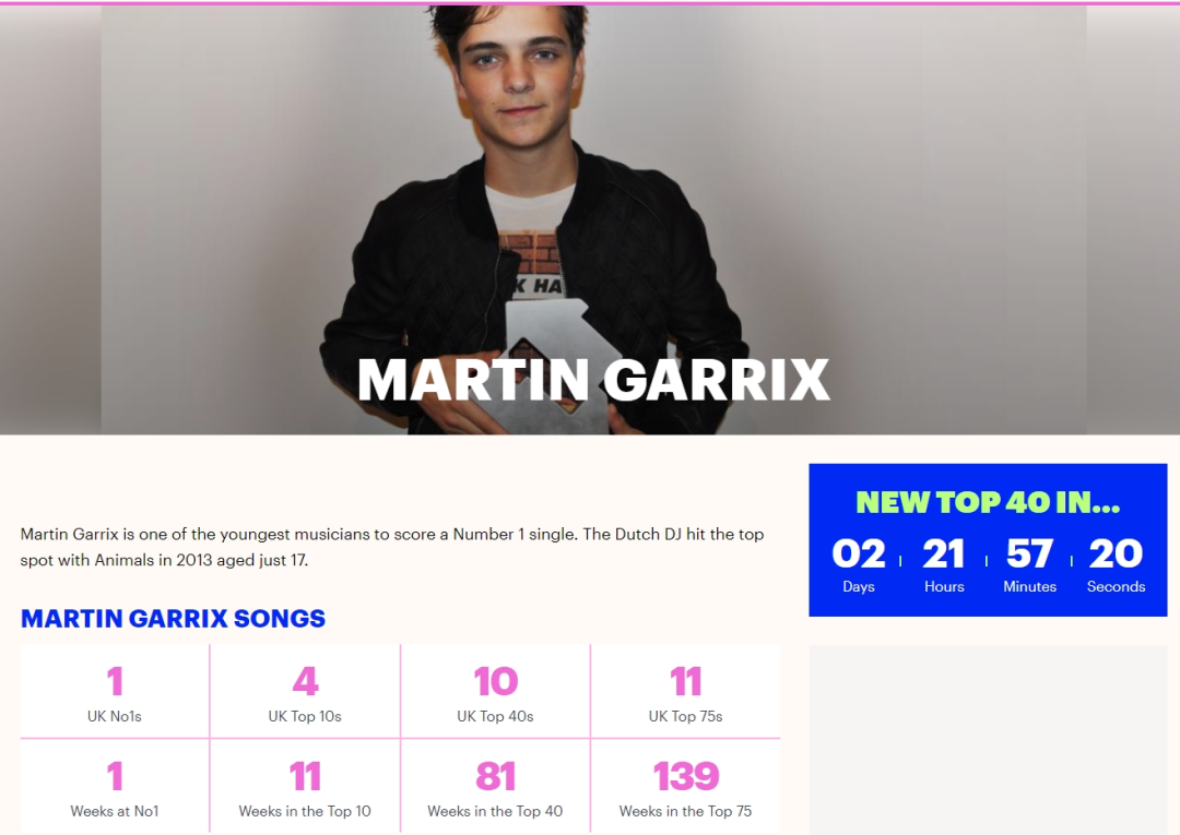 制作了包含UK Singles Chart等项目的《Official Charts》上,Martin Garrix Songs一次登上榜首、四次登上前十、十次登上前四十、十一次登上前七十五。刚才说的是总榜,而在Official Dance Singles Chart上,“小马丁”另有十首作品上榜,其中六首作品跻入前十。这即是三。