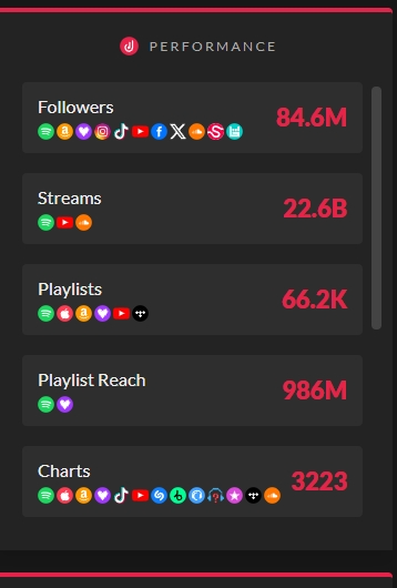 Songstats统计Martin Garrix在十一个平台上拥有8460万粉丝、全网播放量在三个平台上共计达230亿、六个平台上拥有6万张歌单,合9.8亿播放、在十三个流媒体上取得了登入排行榜3223次!!!不得不说,Songstats在计算全网粉丝数、全网音乐播放量、歌单数、歌单播放量、流媒体排行榜上榜次数方面一直很强,把Tidal等十余个流媒体也被记载在内。