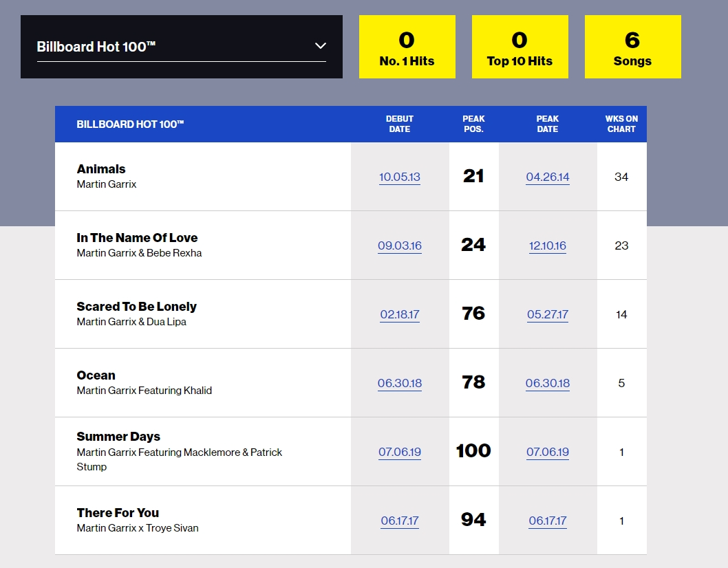 不分音乐流派“圈内圈外”的第三关,那便是有很多在电子音乐、跳舞音乐外的其它“乐”界的其他歌迷们更加崇拜的Billboard。Martin Garrix曾有六首作品进入Billboard Hot 100排行榜,于Billboard Dance Club Songs排行榜进入前三、不止一次进入美国及欧洲多国前十。这即是二。