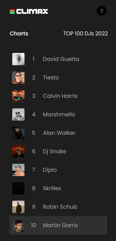 还记得我们在Skrillex篇强调“非常有趣”的Climax Top 100 DJs吗?那是在DJ Mag百大DJ排行榜之外目前同样有很高热度的“世界百大DJ”统计。Climax在大量动态中自称排行榜是通过自创新力算法统计了DJ/制作人们在十个流媒体和社交网络平台的真实数据,且只看真实数据不看选票。Martin Garrix在Climax Top 100 DJs 2022排行榜位居第十。这即是四。