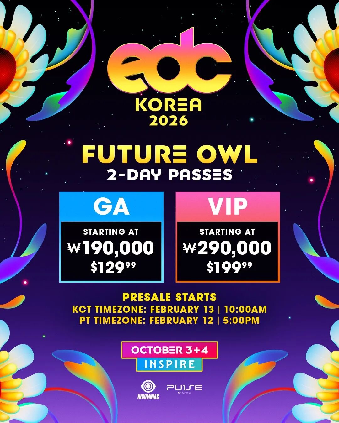 图片来自EDC Korea 2026 图片版权属于原主Future Owl(未来鹰)门票一经开售,已经在很短时间内销售出了成千上万份双日票,而按照EDC官方的品牌调性,阵容揭晓之后则会进入Early Owl(早鹰)的售票阶段;阵容揭晓之前会一直都是Future Owl(未来鹰)。这方面大家也不需要担心呢,没阵容前都是“盲鸟”。图片来自EDC Korea 2026 图片版权属于原主还要提醒大家一点,去年的EDC Korea,严格意义上来说是分为Phase 1 Future Owl和Phase 2 Future Owl的,第一阶段的Future Owl卖完之后,Interpartk国际站上面其实微微上调了官方售价,进入第二阶段的Future Owl售卖。若要延续去年的品牌调性,今年也如此做。图片来自EDC Korea 2026 Official 图片版权属于原主依照目前的了解和可用的依据,EDC Korea 2026年大概率不会削弱自己的阵容,尤其是不会削弱自己的阵容“厚度”。不会削弱自己的阵容“厚度”是什么意思啊?很大可能性还是100组上下的DJ/制作人全阵容;很大可能性还是一半左右的国际DJ/制作人;很大可能性还是留一半左右的席位给韩国本国的DJ/制作人。这就意味着,哪怕电子音乐资讯®仍然很温柔地排除掉韩国本国的DJ/制作人,不谈之,只讨论其中的国际艺人,EDC韩国站2026年的阵容“厚盾”仍然会是中国电音节的2倍到10倍之可怕,而不夸张。假如主办方1Pulse Group更加严谨地去追求国际艺人和韩国本国艺人的“我卢本伟55开”,可以很清晰地预见国际艺人大概会是45~50位左右,本国艺人45~50位左右。至于国际艺人之外,本国艺人的阵容“厚度”差了多少、全阵容的阵容“厚度”差了多少,这就不是电子音乐资讯®的品牌调性希望去讨论,或者“逐帧分析”的问题了。如果实在感兴趣,诸位仍可自行计算。但对我们来说,我们清晰明确了国际艺人的“厚度”,便是完成任务。——————————————————————————
