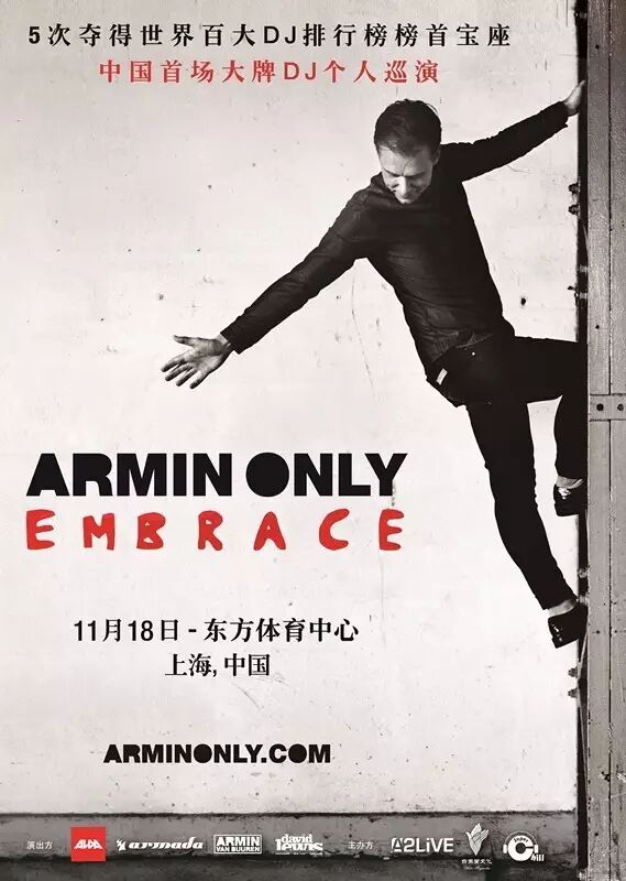 Armin van Buuren的个人巡演计划《Armin Only Embrace》将于今年11月18日登陆中国上海。这次的巡演与专辑《Embrace》紧密结合,Betsy Larkin、Mr. Probz、Kensington、Angel Taylor、Eric Vloeimans、Cimo Fränkel等多位在国际业界享有盛誉的艺人参与到这张专辑的制作,也将参与到这次巡演当中。